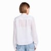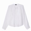 Mot. palaidinė, baltos spalvos, ilgos pūstos rankovės,gili V formos iškirptė, kaklo iškirptė surišama, laisvo kirpimo, lengva medžiaga.