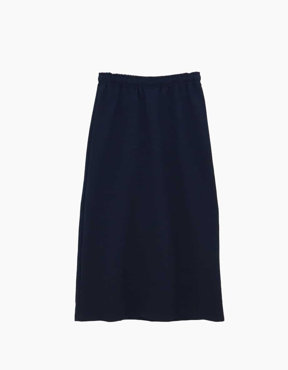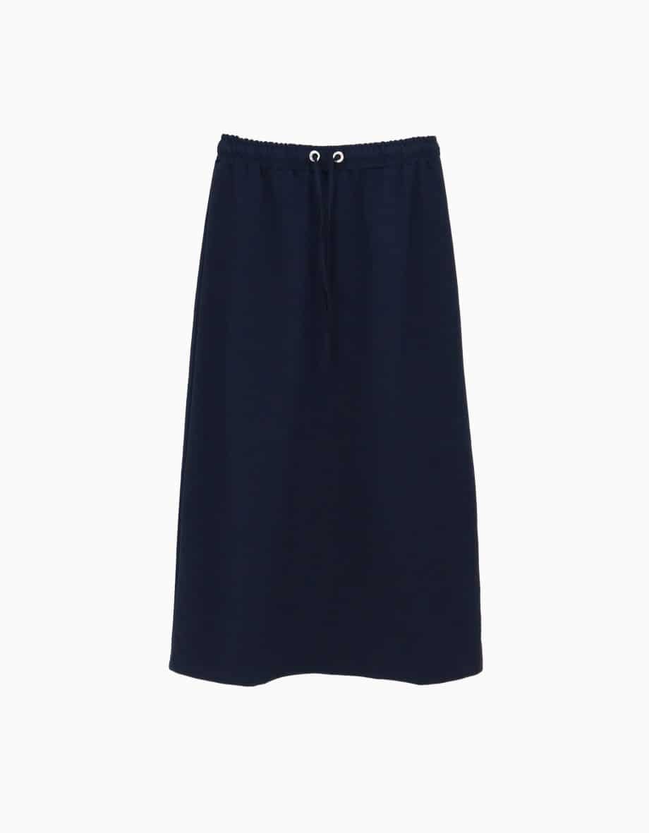 Mot. sijonas, tamsiai mėlynos spalvos, elastingas jusomuo reguliuojamas raišteliais, tiesaus kirpimo, Midi ilgio.