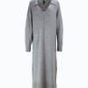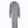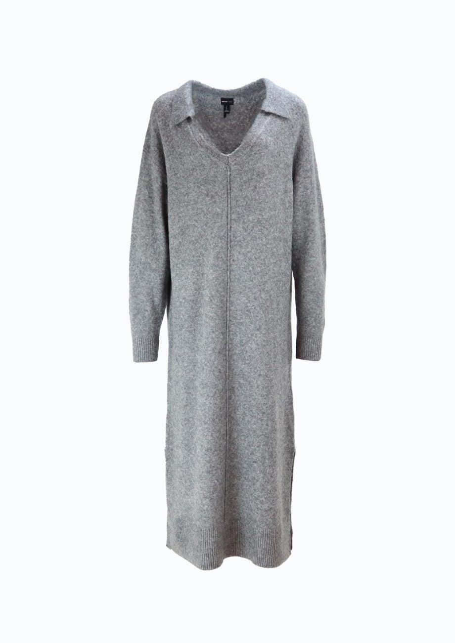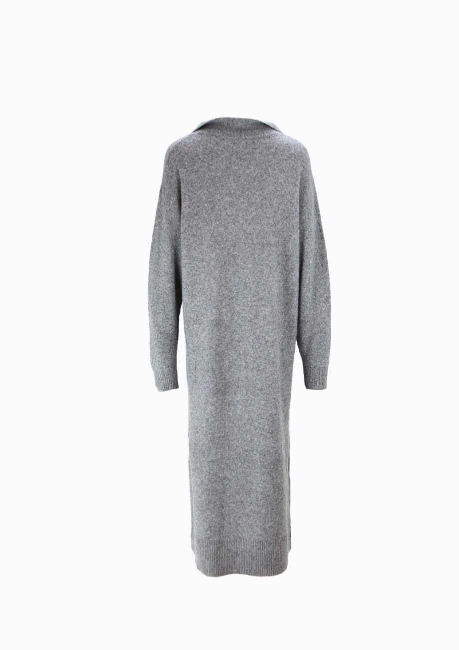 Mot. suknelė, pilkos spalvos, ilgomis rankovėmis, V formos iškirptė, midi ilgis, atlenkiama apykaklė, megzto rašto, skeltukai suknelės apačioje.