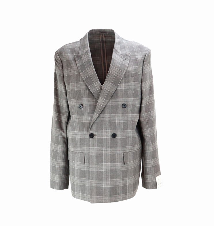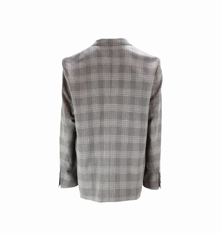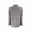 Vyr. švarkas languotu raštu, pilkos spalvos, turi dvi eiles sagų priekyje, turi klasikines apykaklės dalis, apačioje yra kišenės kurios papildo jo elegantiškumą dizainą.