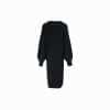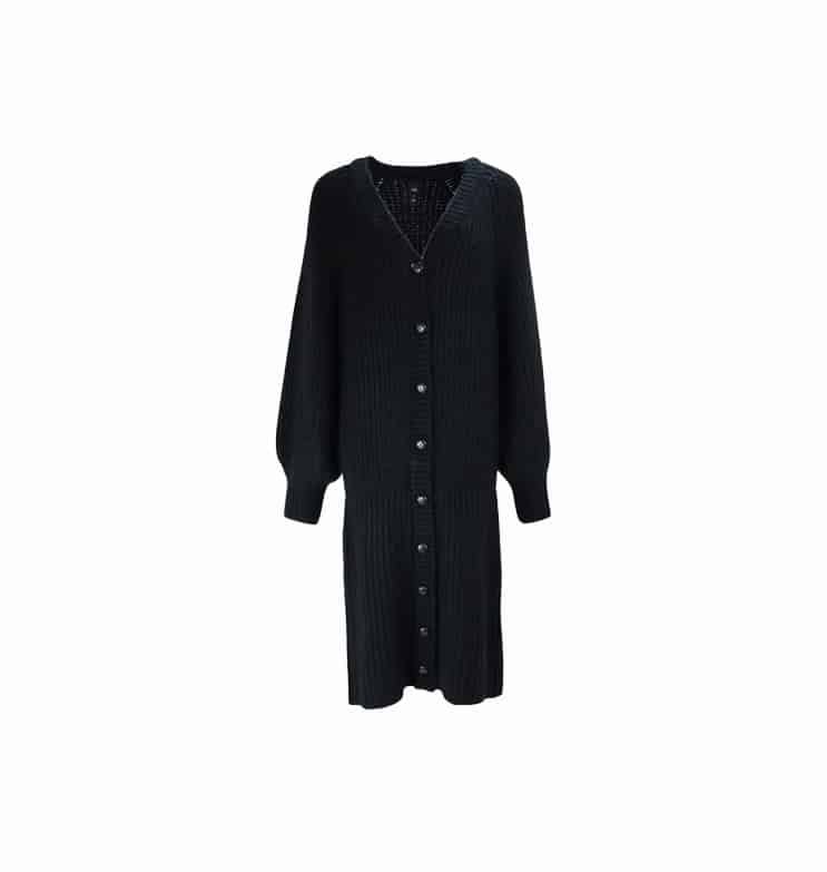 Mot. megzta suknelė, juodos spalvos, sagų užsegimas per visą ilgį, ilgomis pūstomis rankovėmis, audinys storas rumbuotas, tiesaus kirpimo.