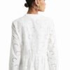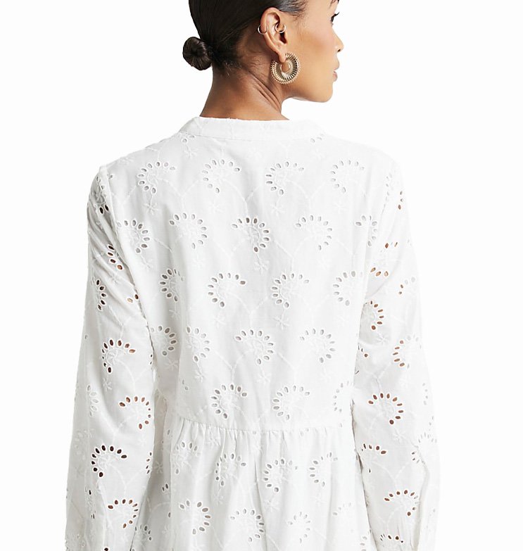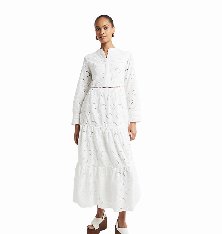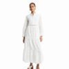 Mot. suknelė, baltos spalvos, ilgomis rankovėmis, apvali kaklo iškirptė, užsegimas sagomis, daugiasluoksnis sijonas, midi ilgis.