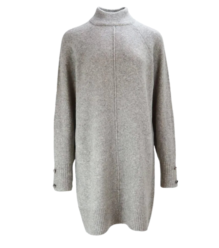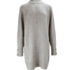 Mot. megzta suknelė, pilkos spalvos, ilgomis rankovėmis, aukštu kaklu, Oversize stilius, mini ilgis.