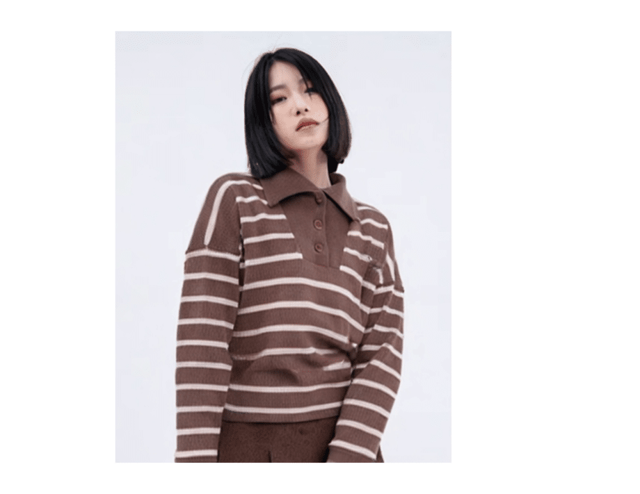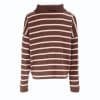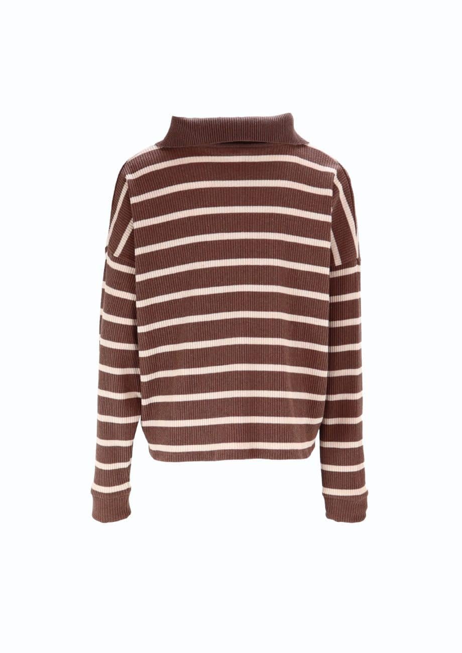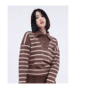 Mot. megztinis, rudos spalvos, ilgomis rankovėmis, dryžuotas, tiesaus kirpimo, užsegimas sagomis, V formos iškirptė, aukšta- atlenkiama apykaklė.