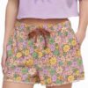 Mot. šortai, gėlių raštas, elastingas juosmuo, šoninės kišenės, surišama raišteliais per juosmeny.