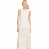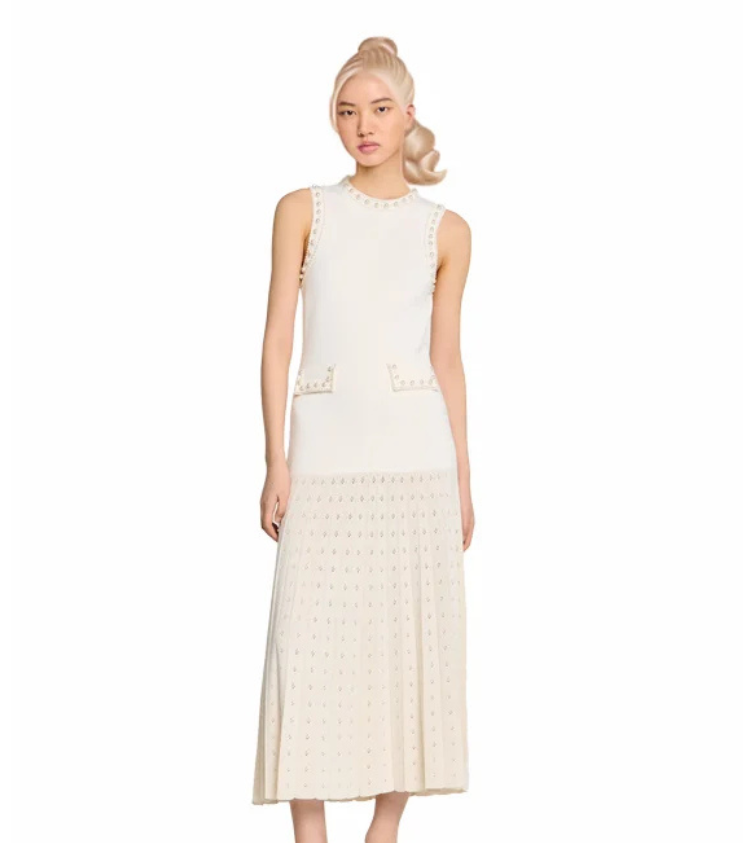 Mot. megzta maksi suknelė, baltos spalvos, berankovė tampri su apvalia iškirpte, perlų karoliukais puoštomis rankovėmis ir kišenėmis bei klostuotu puanteliu sijonu.
