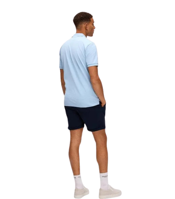 Vyr. marškinėliai, žydros spalvos, trumpomis rankovėmis, marškinių tipo apykaklė, užsegimas sagomis, vienspalvis raštas.