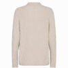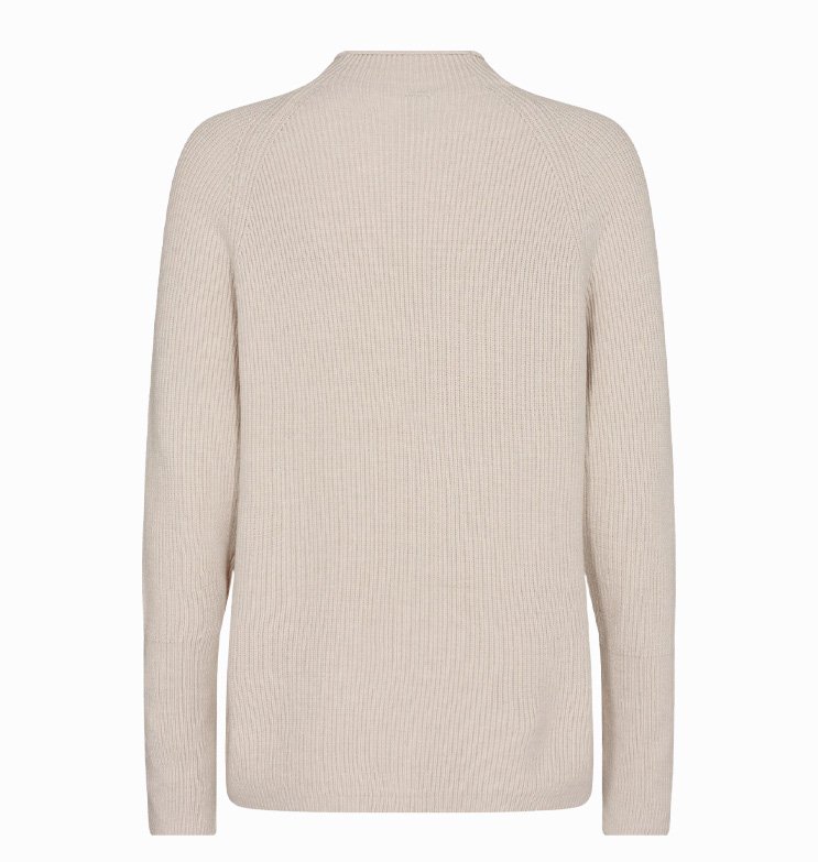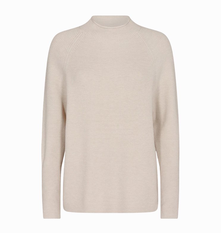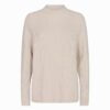 Mot. megztinis, šviesiai smėlio spalvos, minimalistinio dizaino, tiesaus silueto, apykaklė aukšta siaura, ilgomis rankovėmis, audinys stambaus mezgimo, su vertikaliu raštu.