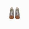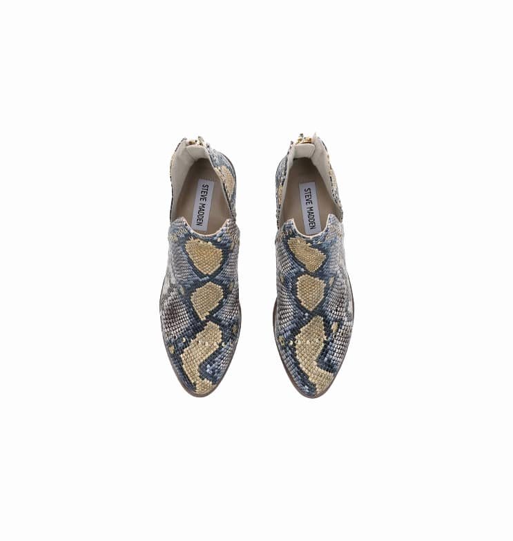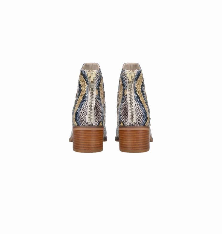 Mot. aulinukai, rudos/ geltonos/ mėlynos spalvos, apvali batų nosis, gyvatės raštas, užsegimas užtrauktuku, blokinis kulnas, aukso spalvos smeigės,