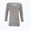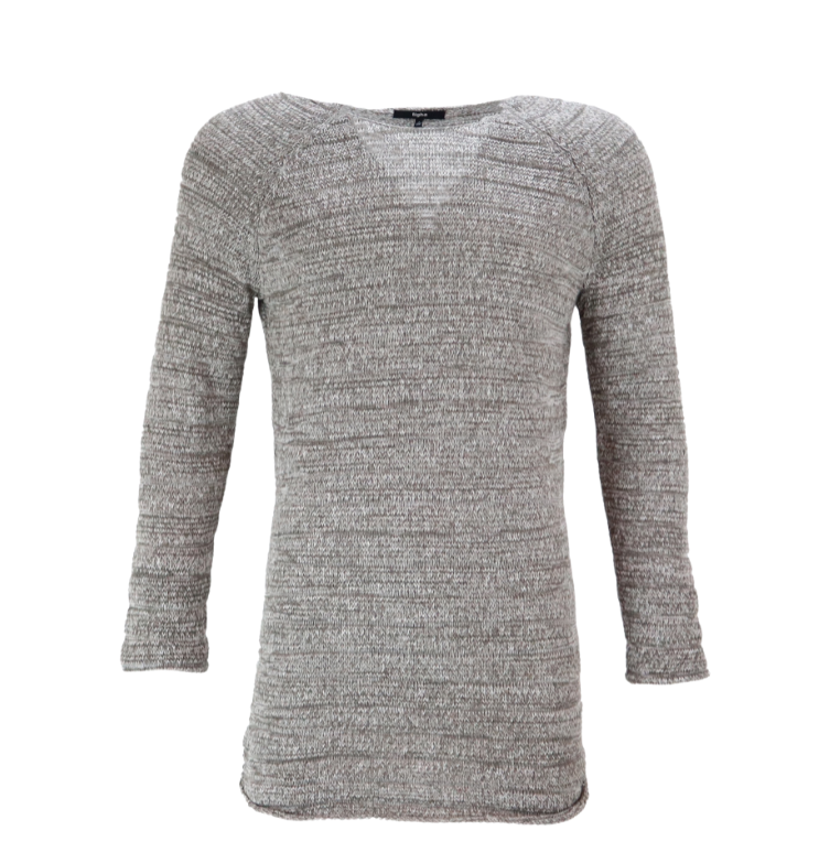 Vyr. megztinis pilkos spalvos, dryžuoto rašto, ilgomis rankovėmis, įgulos kaklas, briaunuoti rankogaliai.