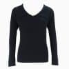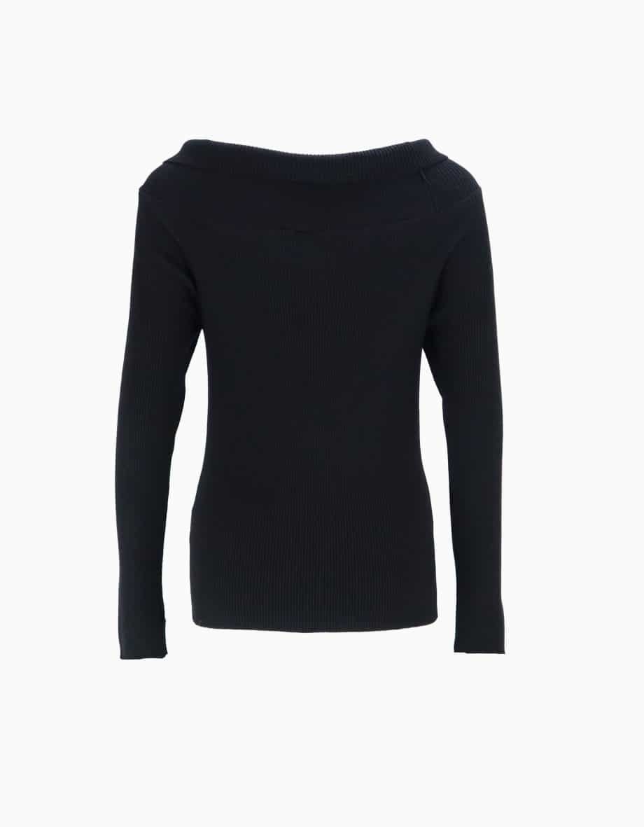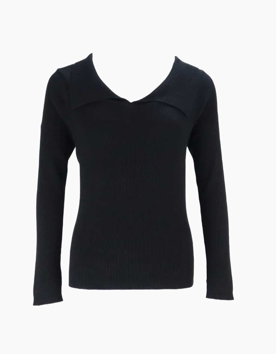 Mot. megztinis juodos spalvos, V formos iškirptė, atlenkiama apykaklė, ilgos rankovės, prigludusi.