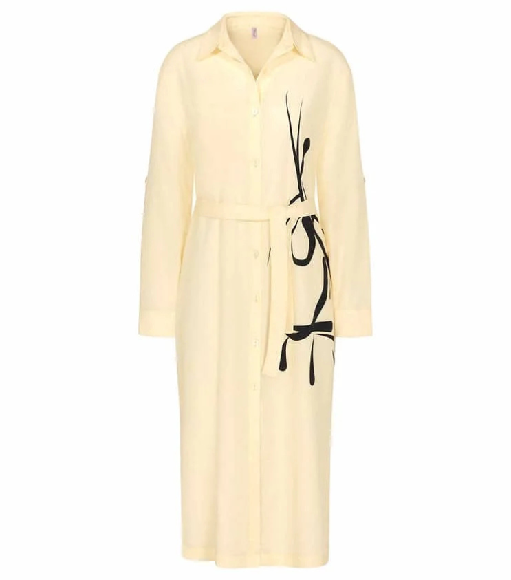 Mot. marškinių tipo suknelė, geltonos spalvos, ilga, ilgomis rankovėmis, užsegimas sagomis, atlenkiama apykaklė, dirželiu surišama.