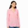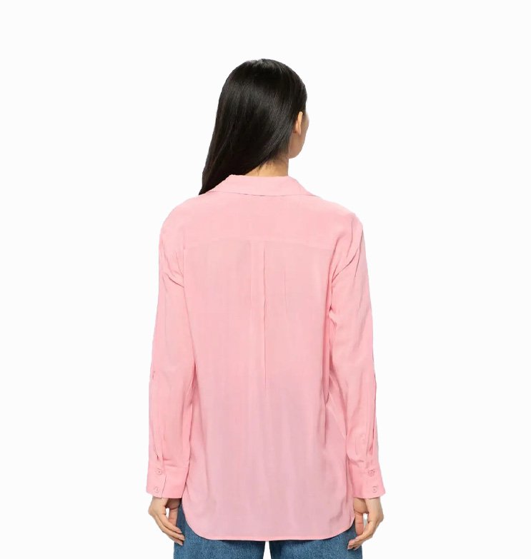 Mot. marškinukai, rožinės spalvos, ilgomis rankovėmis, V formos iškirptė, užsegimas per visą ilgį sagomis, kišenės ant krūtinės, nugaros dalis prailginta.