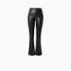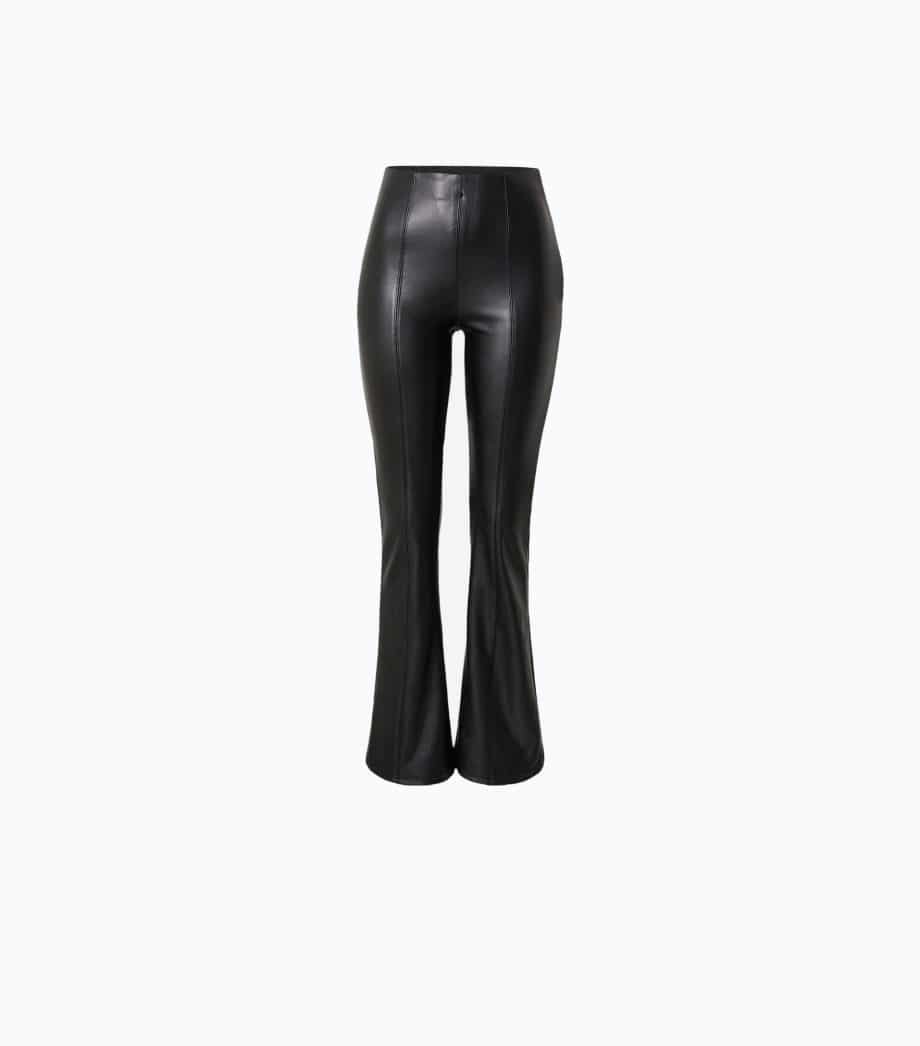 Mot. kelnės, juodos spalvos, dirbtinės odos, vienspalvės, ilgos, platėjančios stilius, aukštas juosmuo, elastine juosta, užsegimas užtrauktuku.