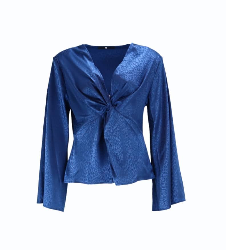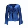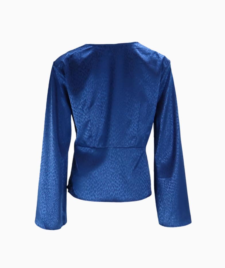 Mot. palaidinė, tamsiai mėlynos spalvos, ilgomis rankovėmis, V formos iškirptė, užsegimas užtrauktuku, plačios rankovės.