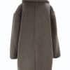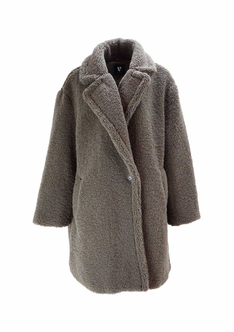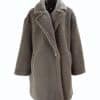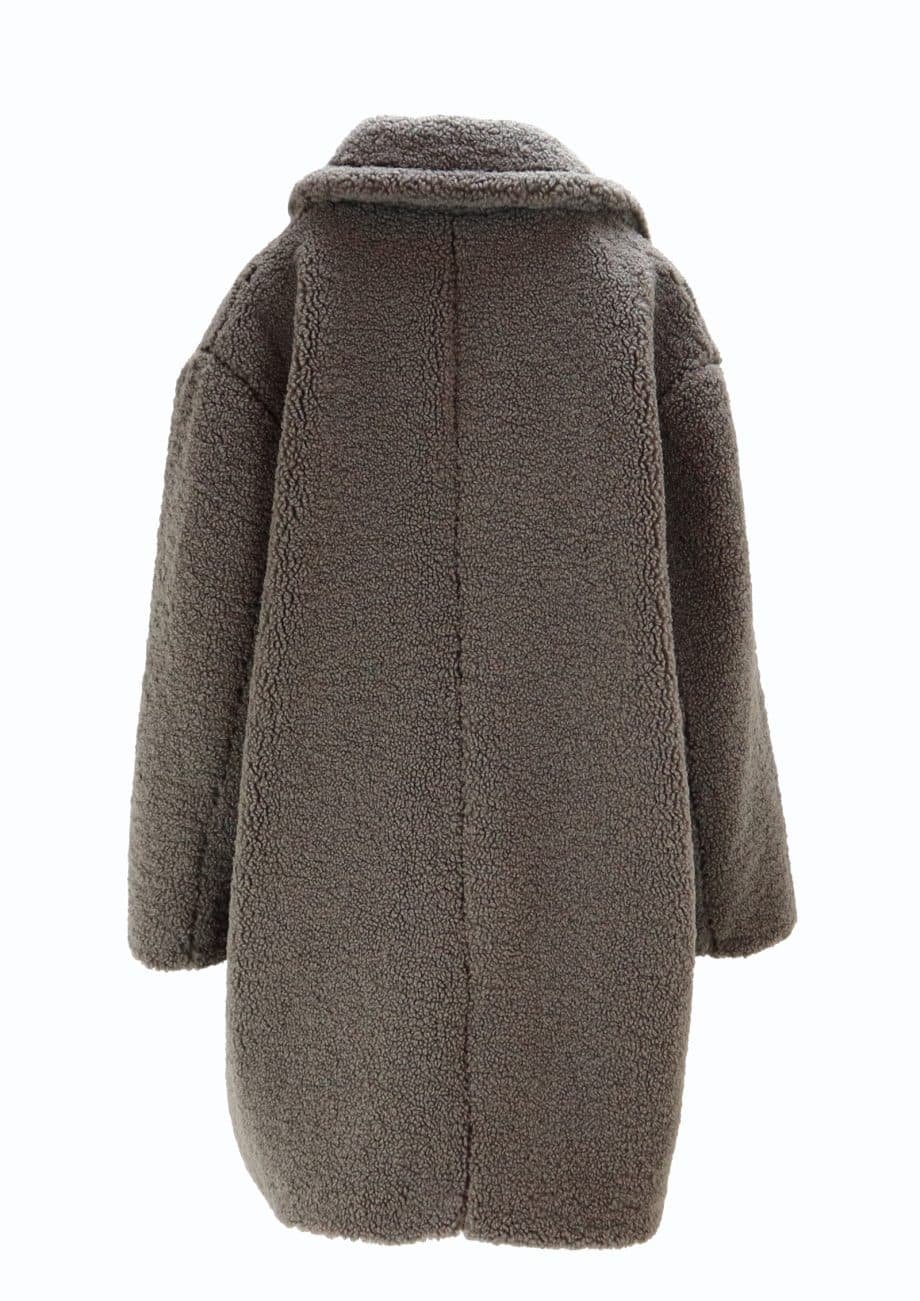 Mot. Teddy stiliaus paltas, pilkos spalvos, ilgomis rankovėmis, užsegimas sagomis, V formos iškirptė, atlenkiama apykaklė, šoninės kišenės, midi ilgio.