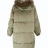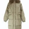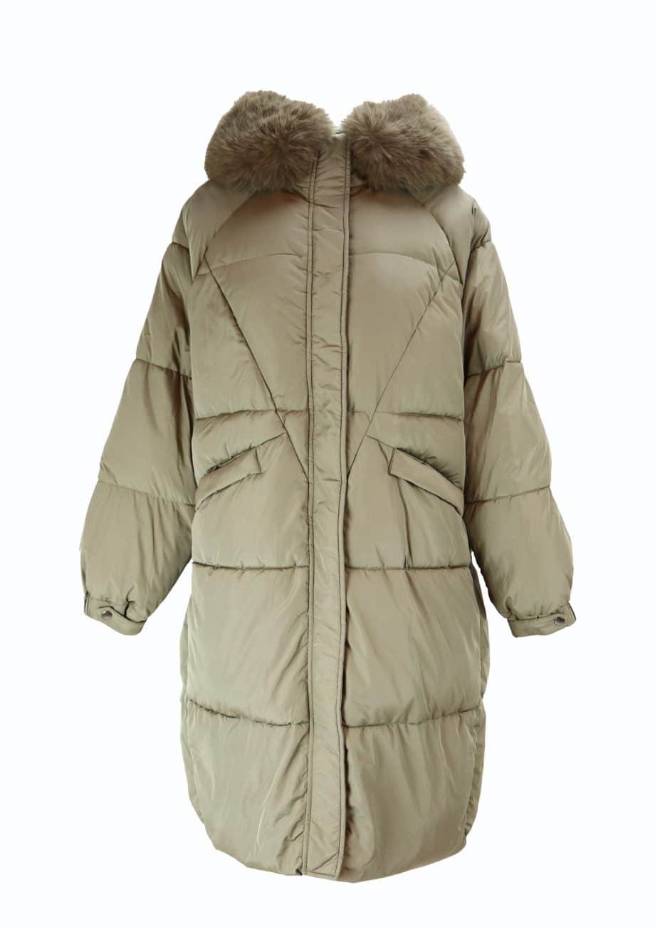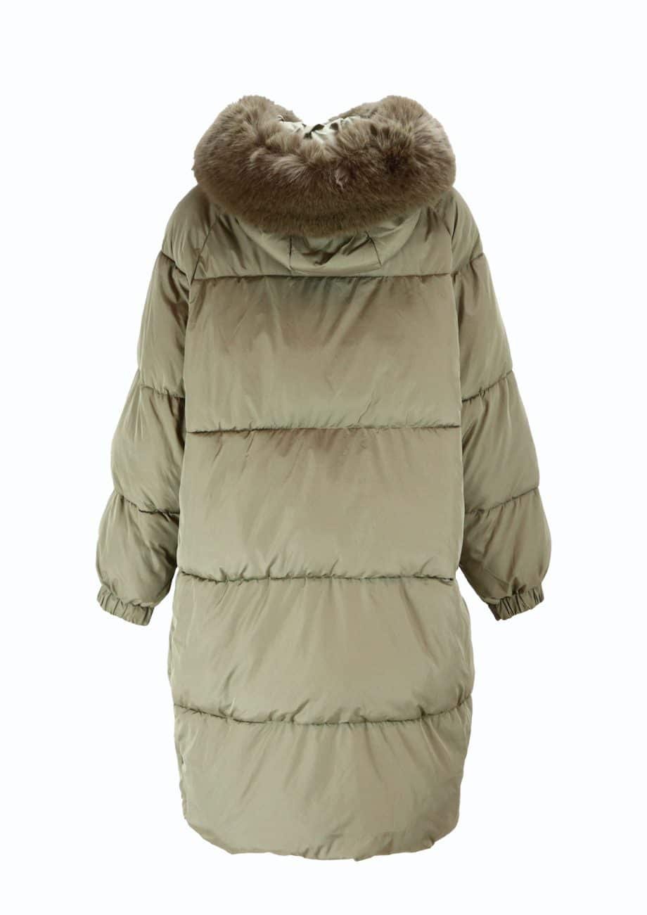 Mot. dygsniuota striukė, chaki spalvos, ilgomis rankovėmis, gobtuvas su dirbtinio kailio apdaila, užsegimas užtrauktuku ir spaudėmis, šoninės kišenės.