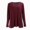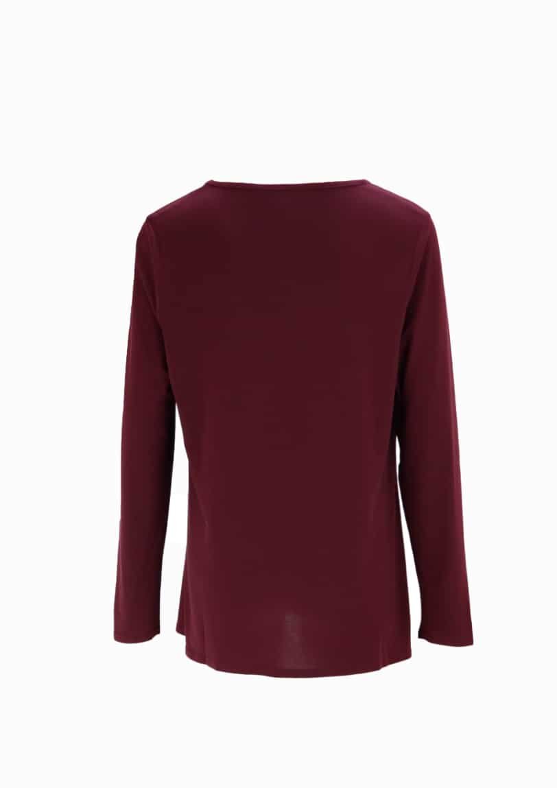 Mot. palaidinė, tamsios vyšninės spalvos, ilgomis rankovėmis, V formos iškirptė, paprastas spalvos dizainas.