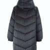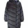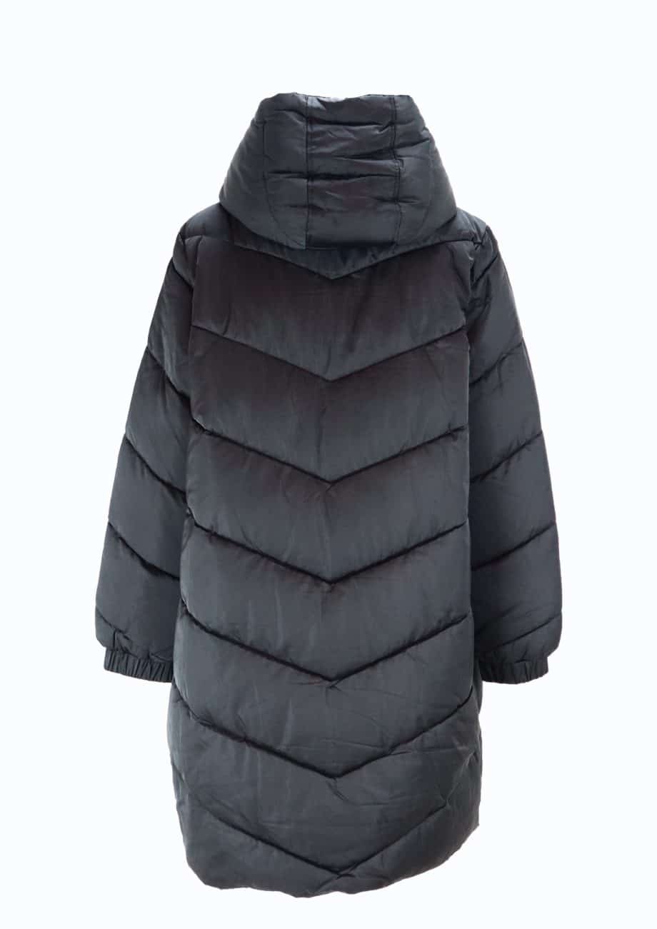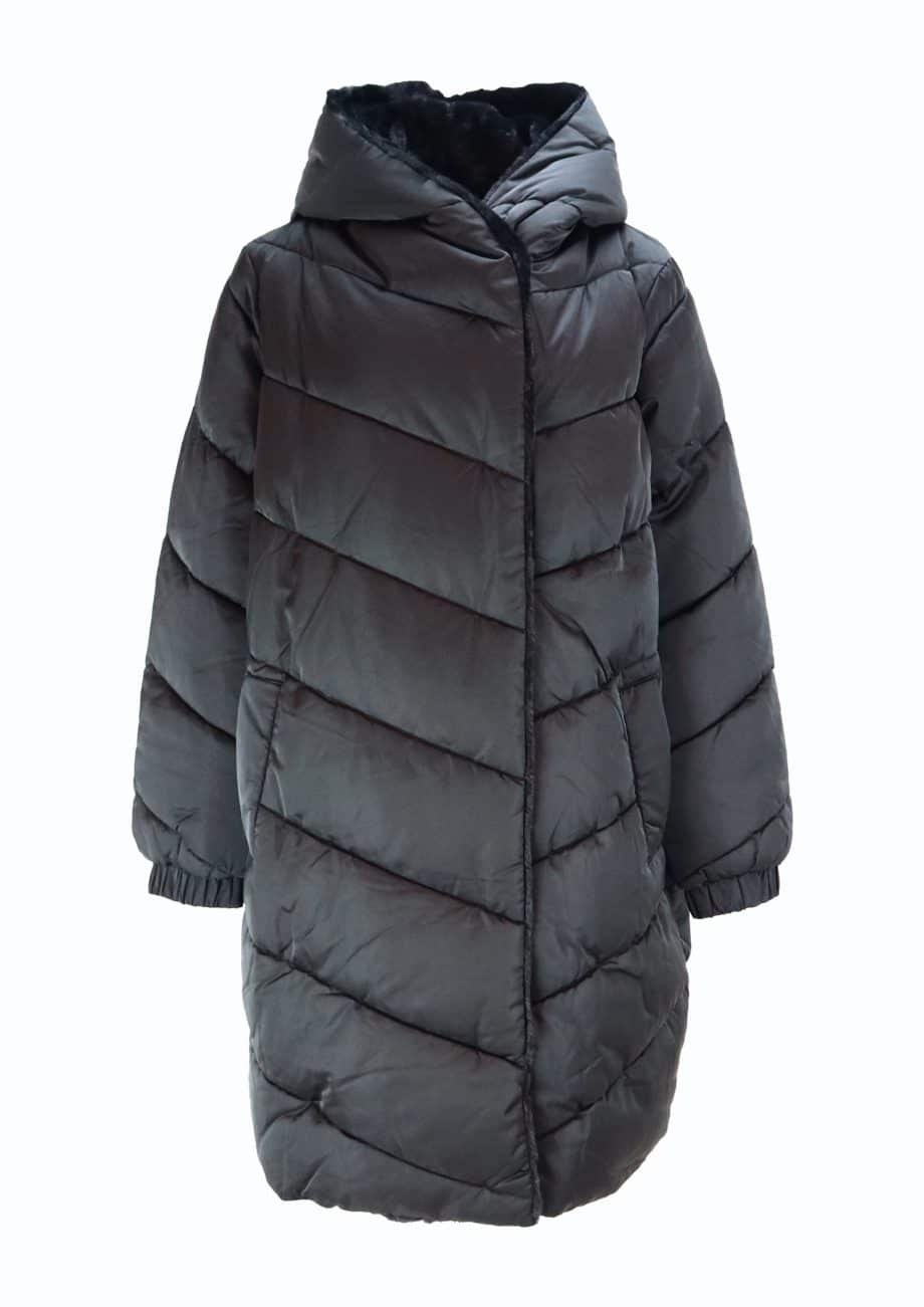 Mot. striukė, juodos spalvos, ilgomis rankovėmis, užsegimas spaudėmis, gobtuvas su dirbtiniu kailiu, šoninės kišenės, tiesaus kirpimo, dygsniuota, midi ilgio.