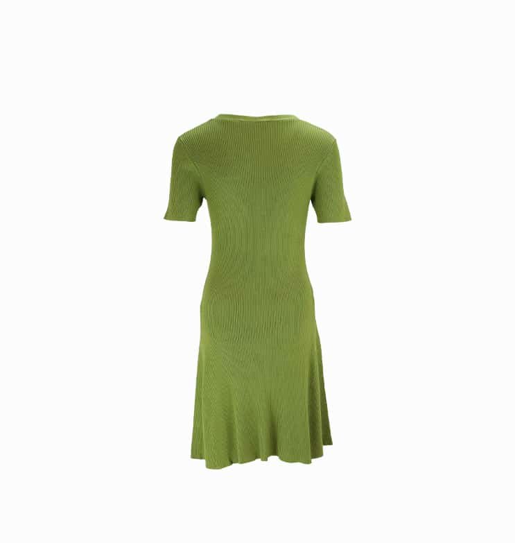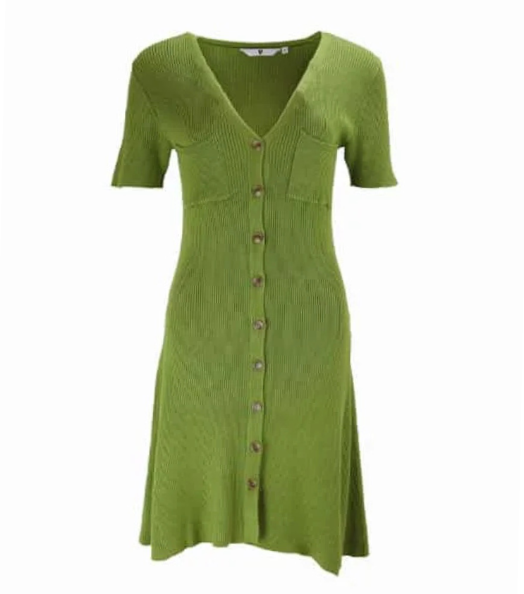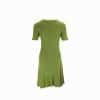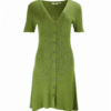 Mot. suknelė, žalios spalvos. trumpomis rankovėmis, užsegimas per visą priekį, turi V formos iškirptę, dvi kišenės priekyje.