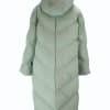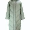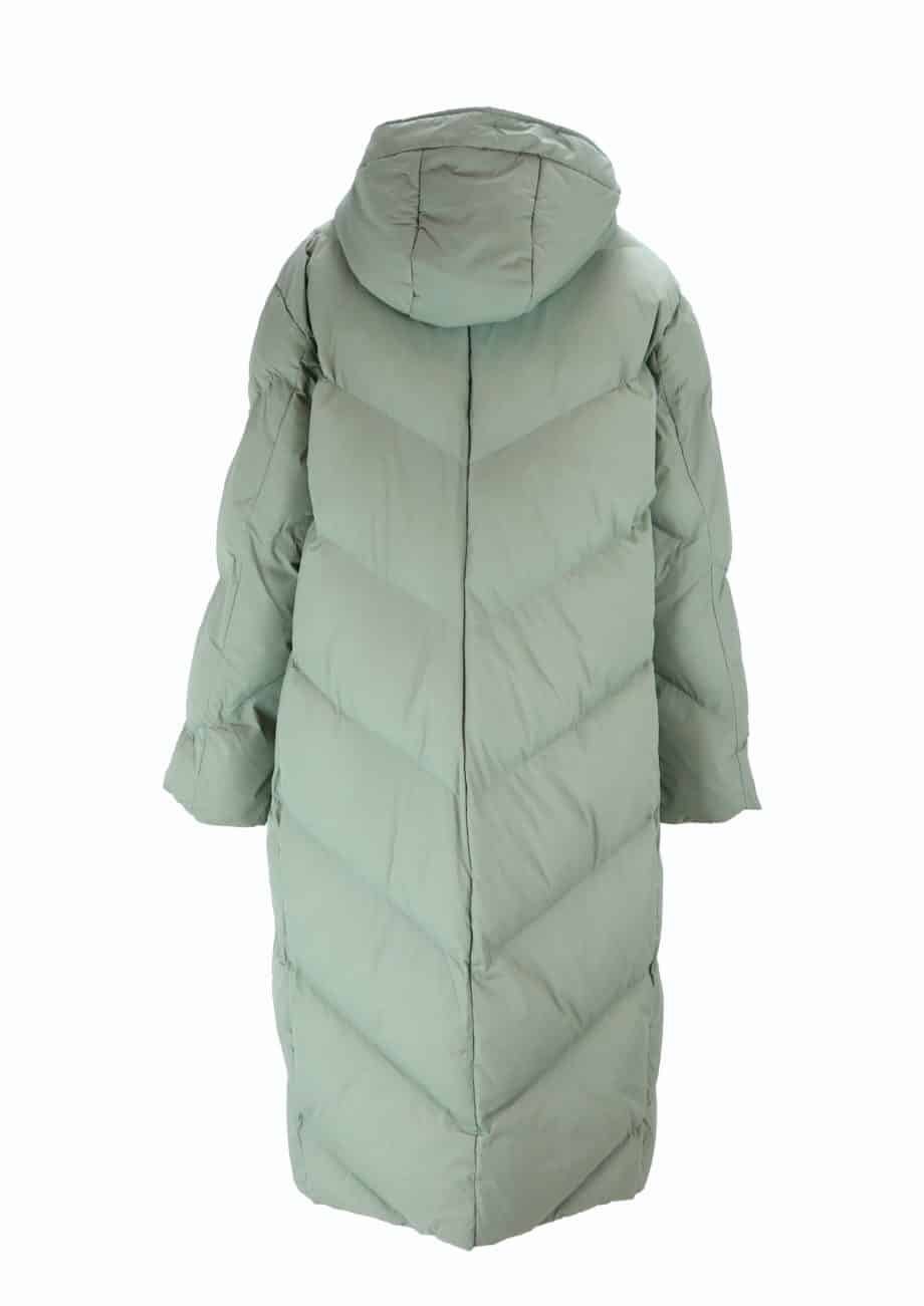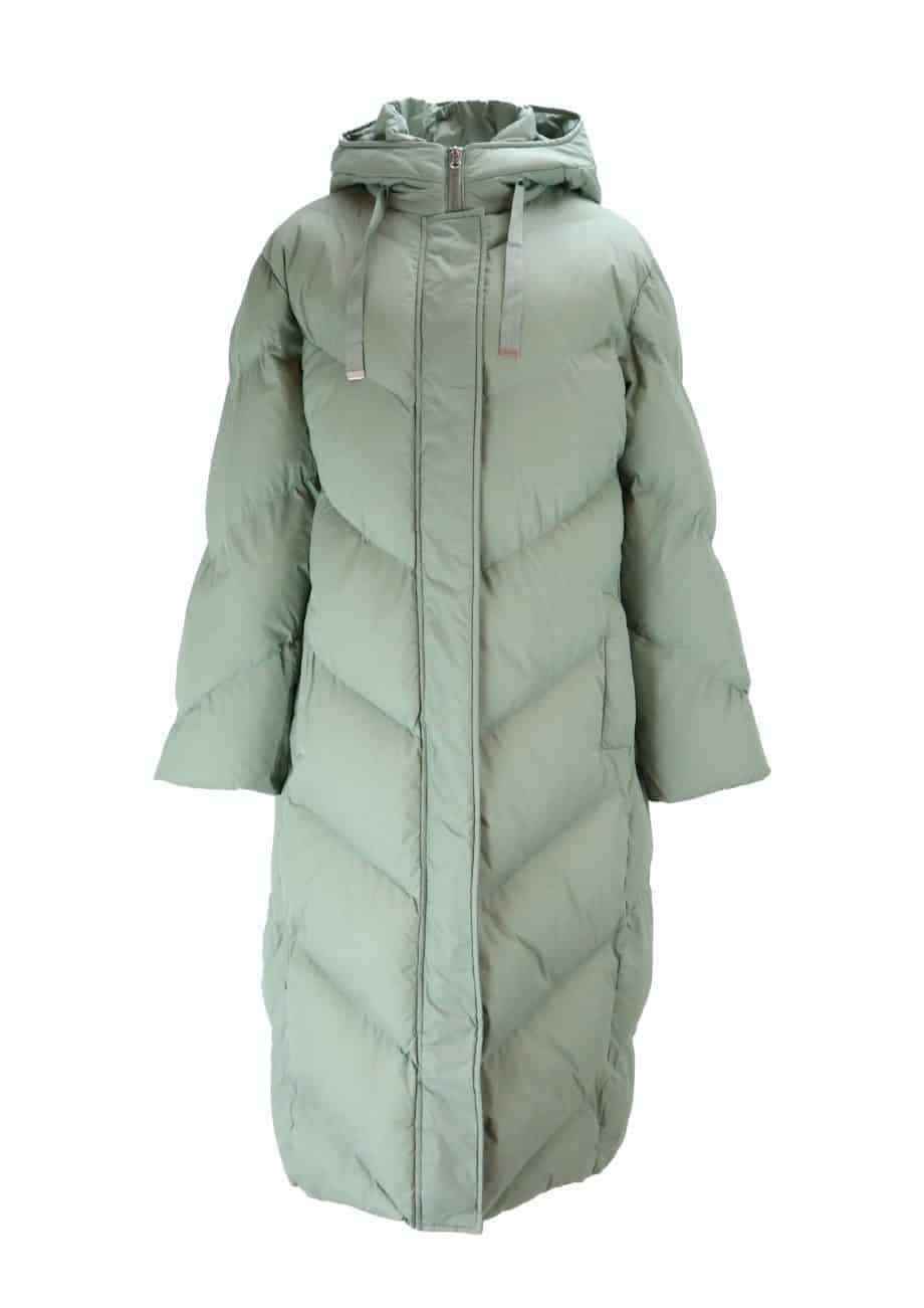 Mot. dygsniuota striukė, žalios spalvos, ilgomis rankovėmis, užsegimas užtrauktuku ir spaudėmis, gobtuvas, šoninės kišenės, midi ilgio.