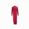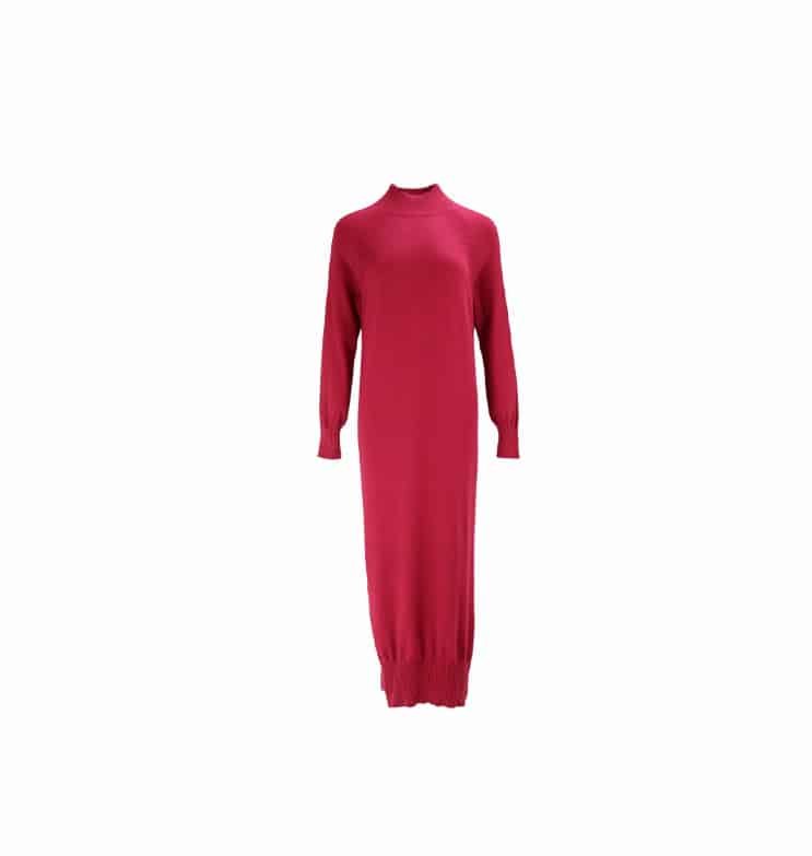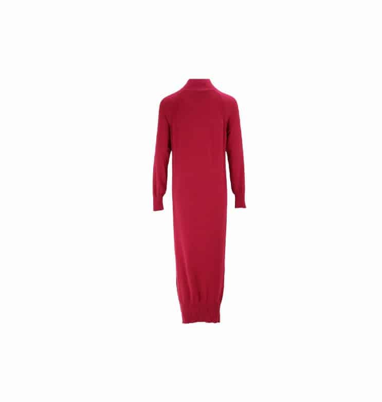Mot. suknelė, raudonos spalvos, ilgomis rankovėmis, megzta, aukšta apykaklė, dekoratyvinės siūlės ties pečiais ir rankovėmis.