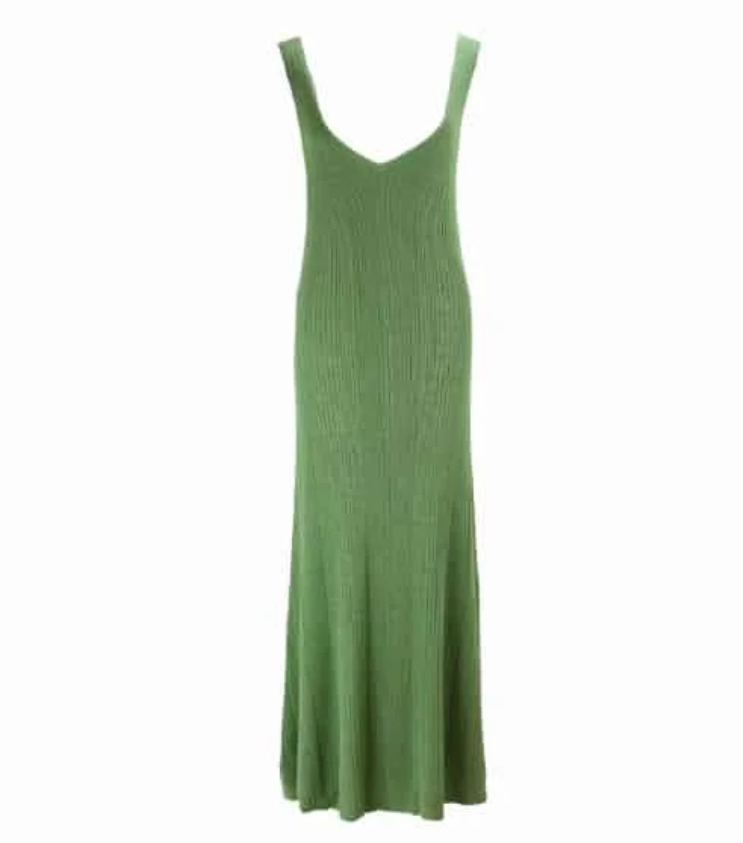 Mot. suknelė, žalios spalvos, gili V formos iškirptė, plačios petnešėlės, tampri medžiaga, laisvo ir lengvai krintančio silueto, midi ilgis.