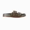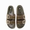 Mot. šlepetės, chaki spalvos, apvali ir atvira batų nosis, plokščias padas, be užsegimo, dekoruota smeigėmis ir auksinės spalvos sagtimis.
