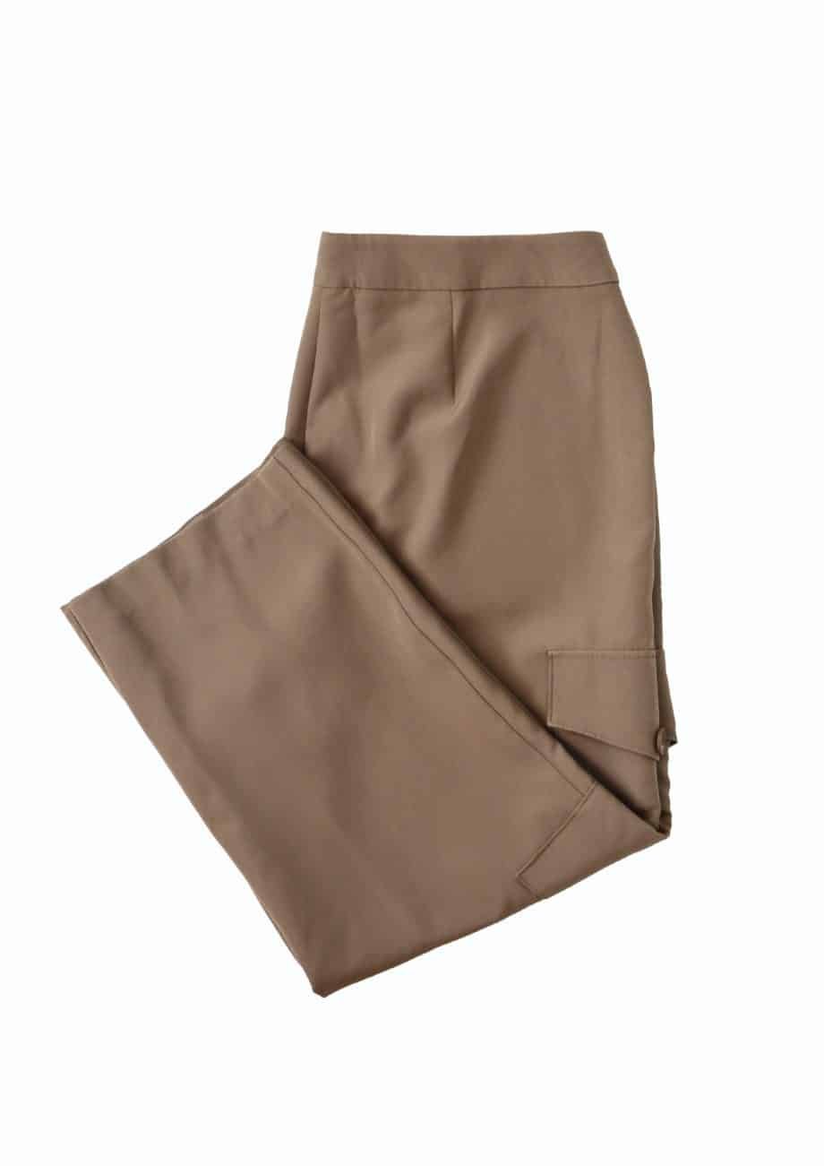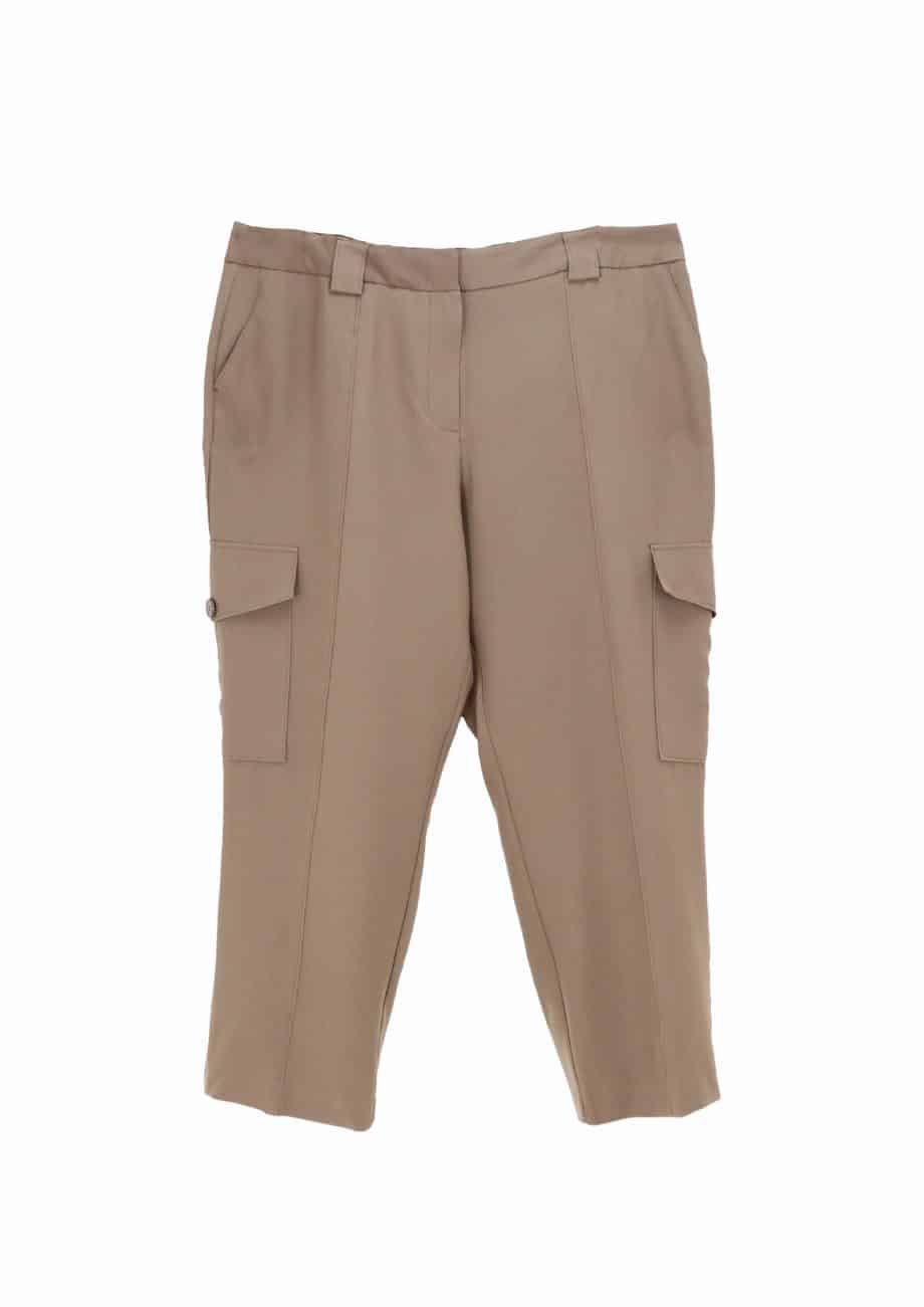 Mot. kelnės, rudos spalvos, siaurėjančio kirpimo, aukštas juosmuo, užsegimas užtrauktuku ir kabliukais, šoninės kišenės, diržo kilpos.