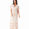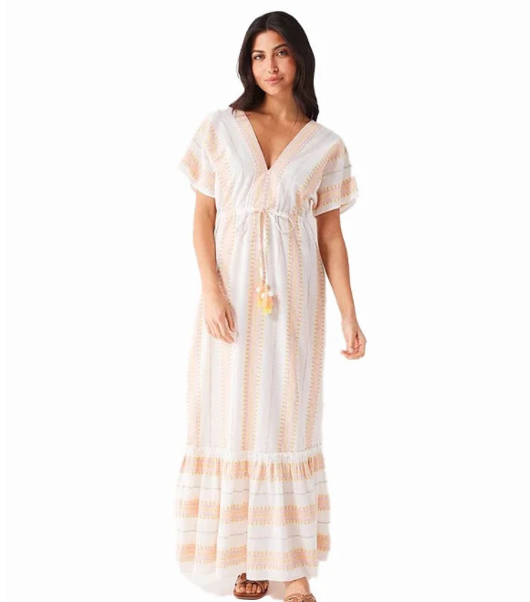 Mot. suknelė, baltos spalvos, gili V formos kaklo iškirptė, trumpos rankovės, liemuo reguliuojamas raišteliais, maxi ilgis, dryžuotas raštas, laisvo stiliaus.