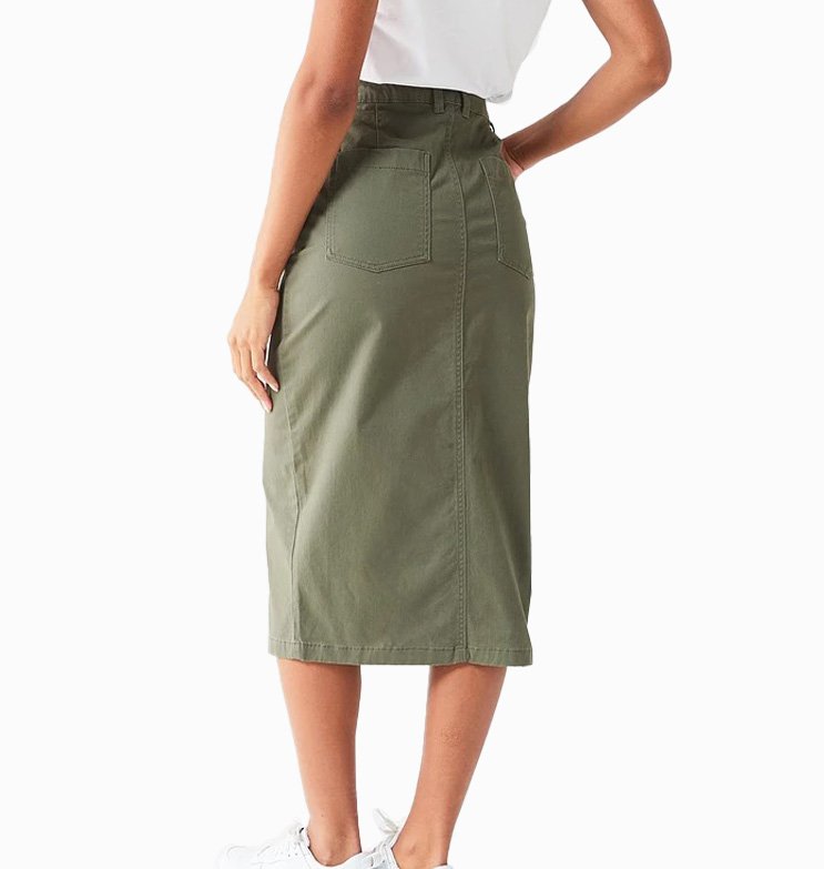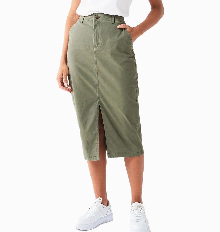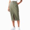 Mot. džinsinis sijonas, chaki spalvos, aukštas liemuo, šoninės kišenės, midi ilgis, užsegimas sagute ir užtrauktuku, diržo kilpos, skeltukas sijono apačioje.