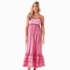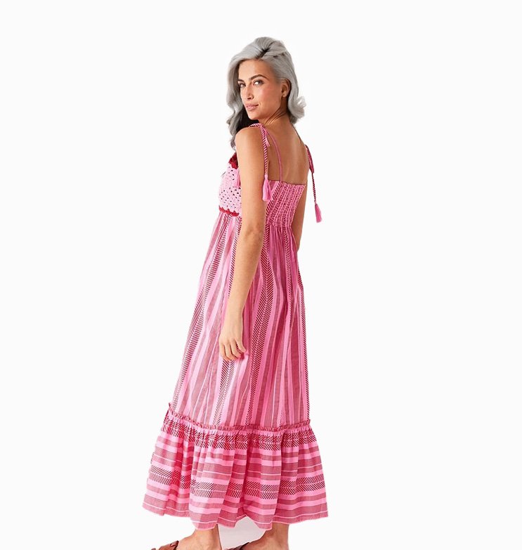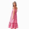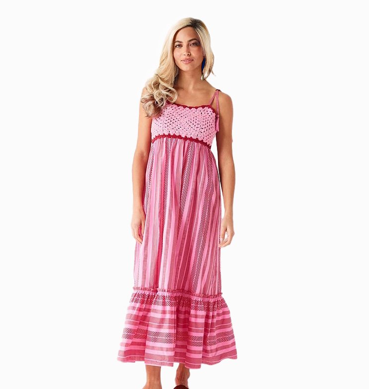 Mot. suknelė, rožinės spalvos, kvadratinė kaklo iškirptė, nėriniai, plonos reguliuojamos petnešėlės, dryžuotas raštas.