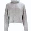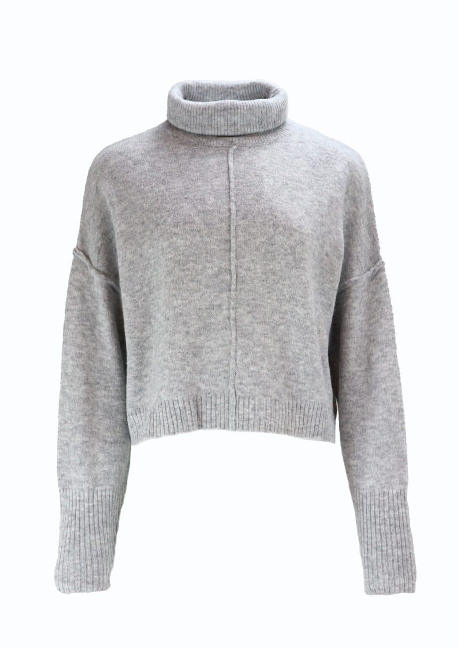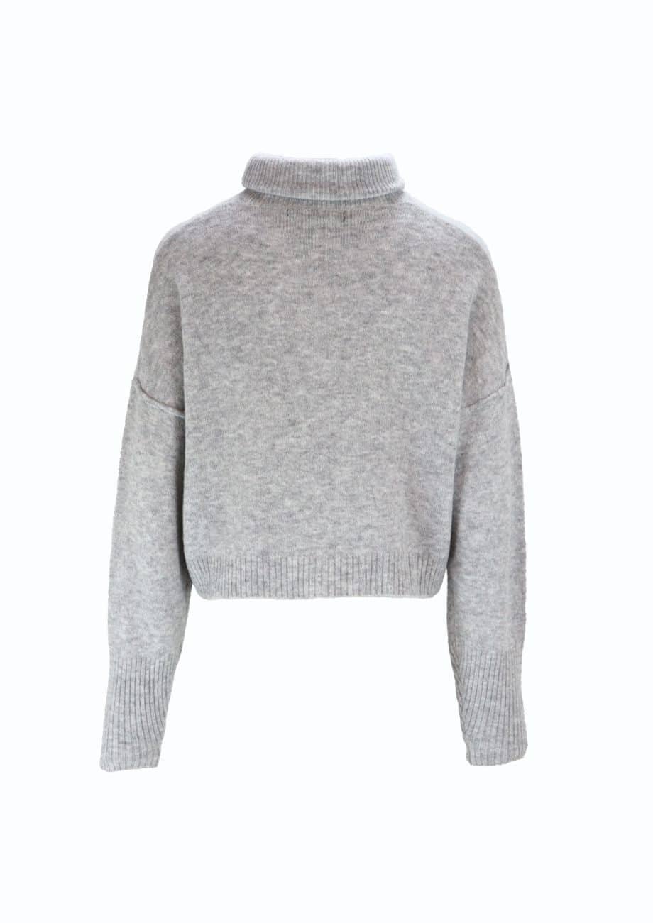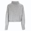Mot. megztinis, pilkos spalvos, aukštu kaklu, ilgomis rankovėmis, trumpas, megzto rašto.
