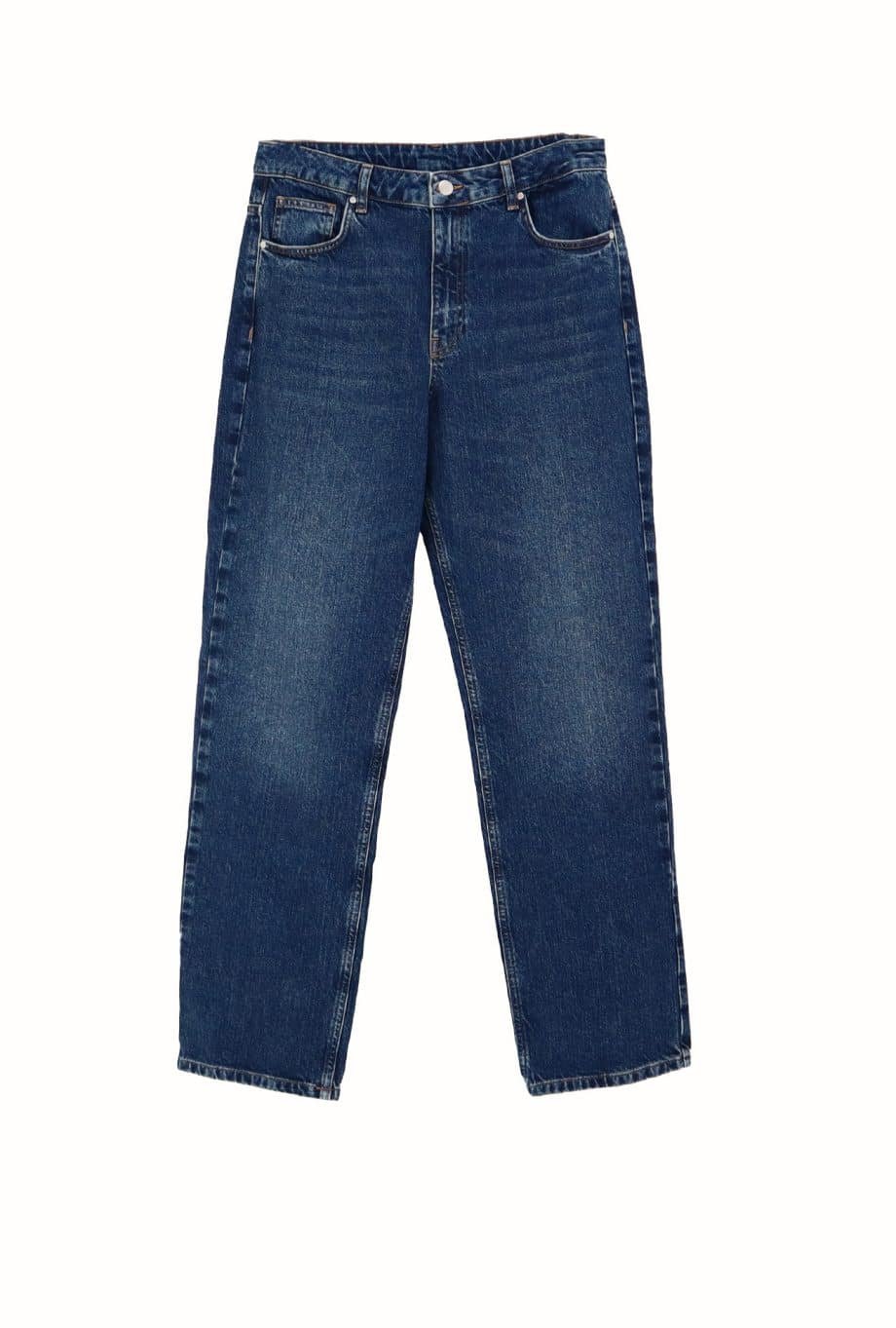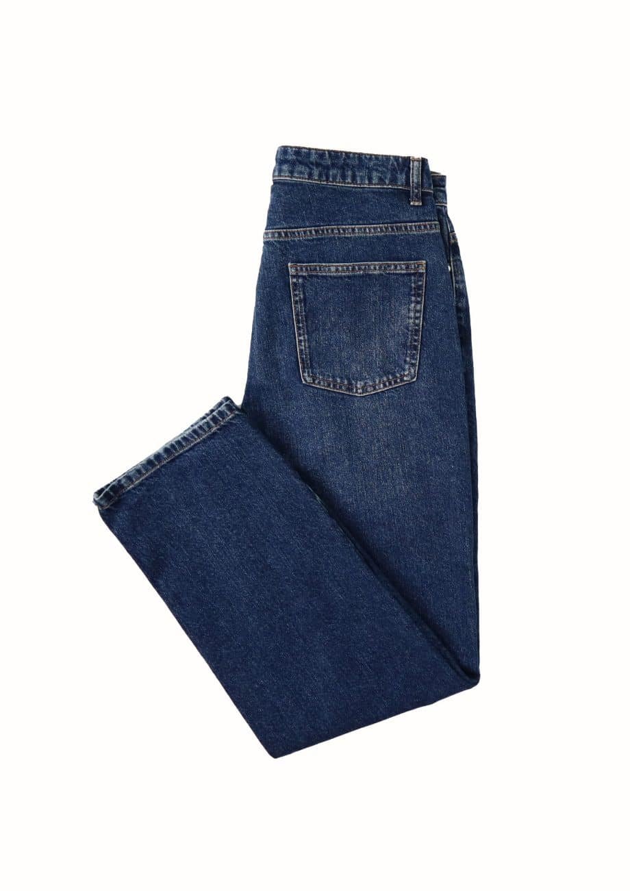 Mot. džinsai, tamsiai mėlynos spalvos, tiesaus kirpimo, aukštas liemuo, užsegimas sagomis ir užtrauktuku, 5 kišenių dizainas, diržo kilpos.