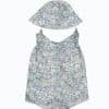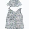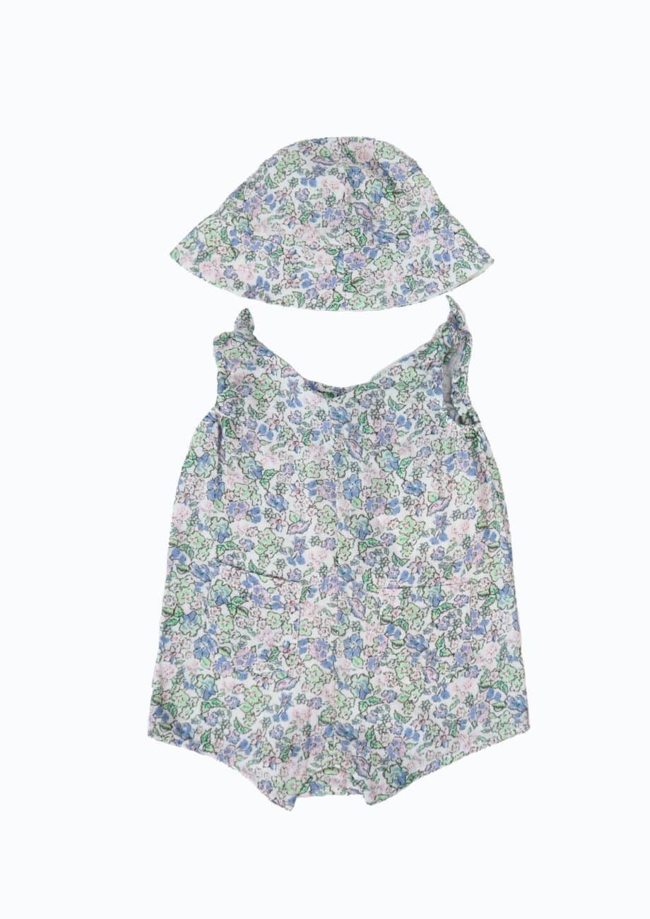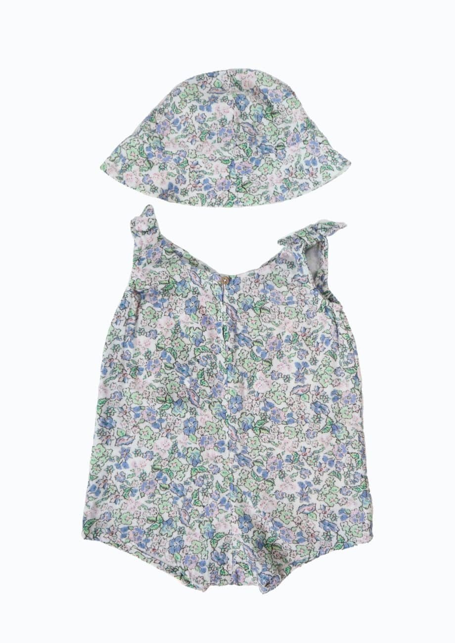 Vasariškas bodžio ir kepuraitės komplektas, pastelinių spalvų gėlių raštas, be rankovių, priekinės kišenės, užsegimas apačioje. Dydis- 12-18 months.