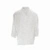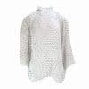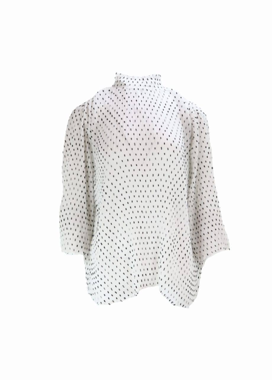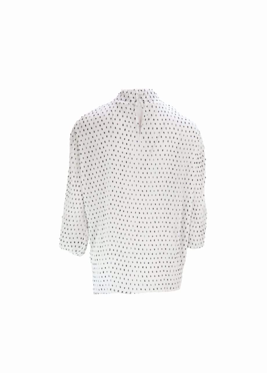 Mot. palaidinė, baltos/ juodos spalvos, ilgomis rankovėmis, raštuota, stati apykaklė, užsegimas sagute, laisvo kirpimo, plonas audinys.