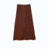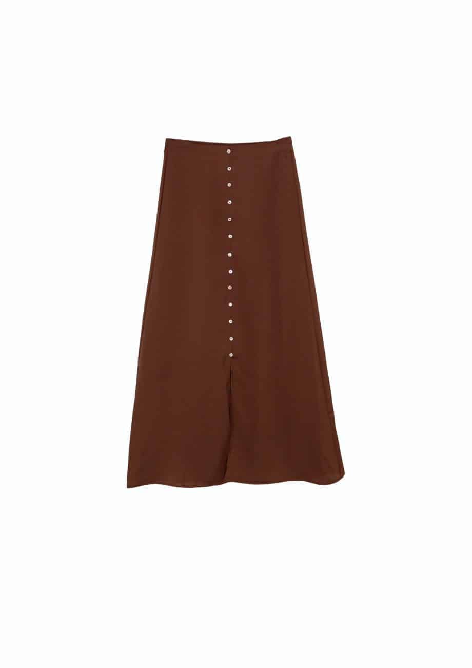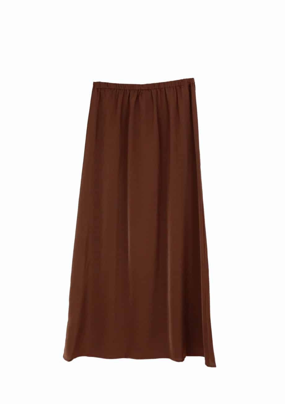 Mot. sijonas, rudos spalvos, maxi ilgio, aukštas juosmuo, be užsegimo, skeltukas sijono apačioje, laisvo kirpimo, elastingas juosmuo.