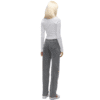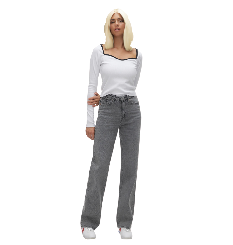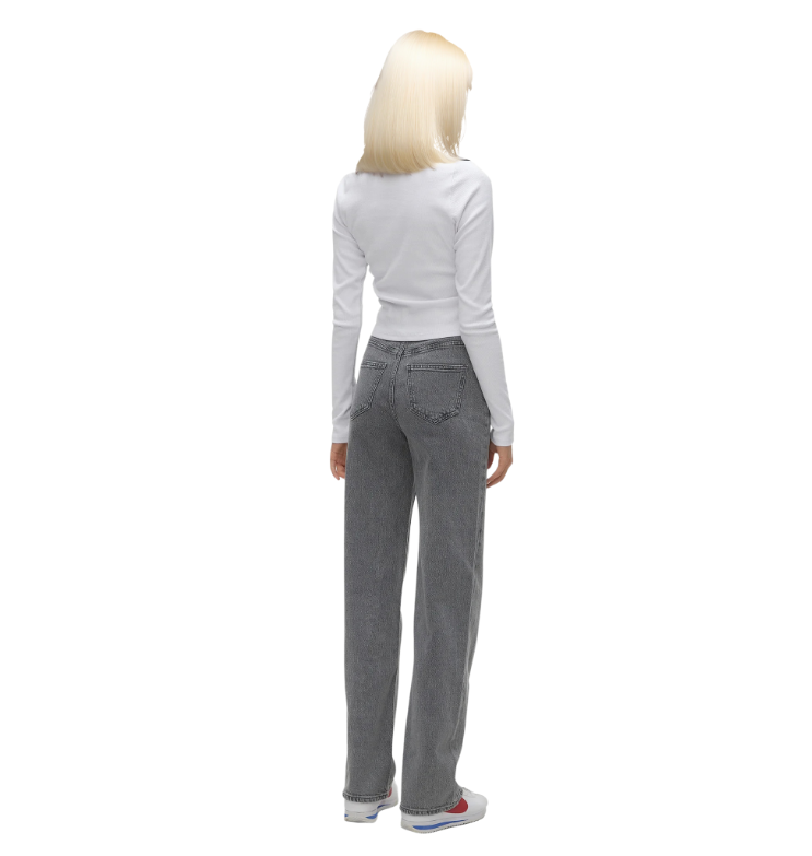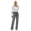 Mot. džinsai, pilkos spalvos, aukštas liemuo, užsegimas sagute ir užtrauktuku, diržo kilpos.
