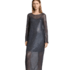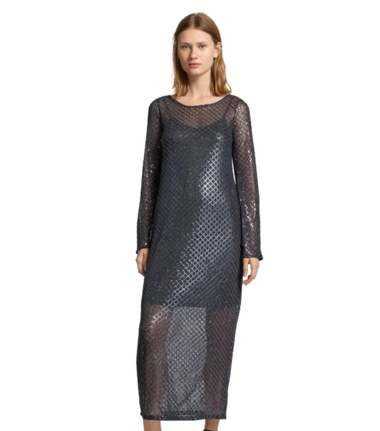 Mot. suknelė, pilkos spalvos, ilgomis rankovėmis, laisvo kirpimo su permatomu viršutiniu tinklelio sluoksniu, puoštu blizgučiais, apvali kaklo iškirptė.