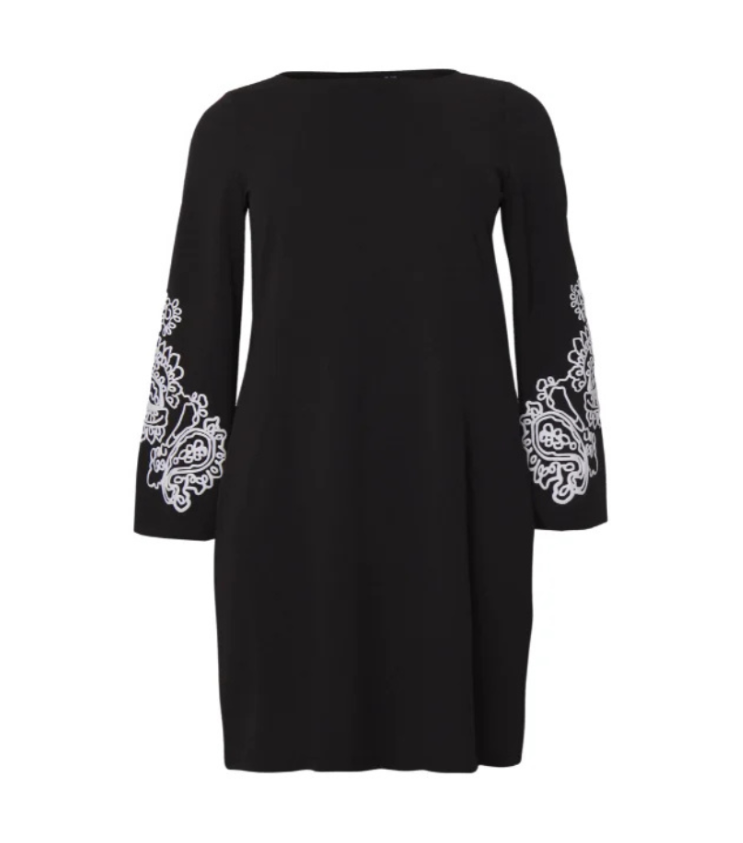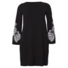 Mot. suknelė, juodos spalvos, trumpa, tiesaus kirpimo ilgomis rankovėmis, laivelio formos, rankovės ilgos puoštos baltu siuvinėjimu.