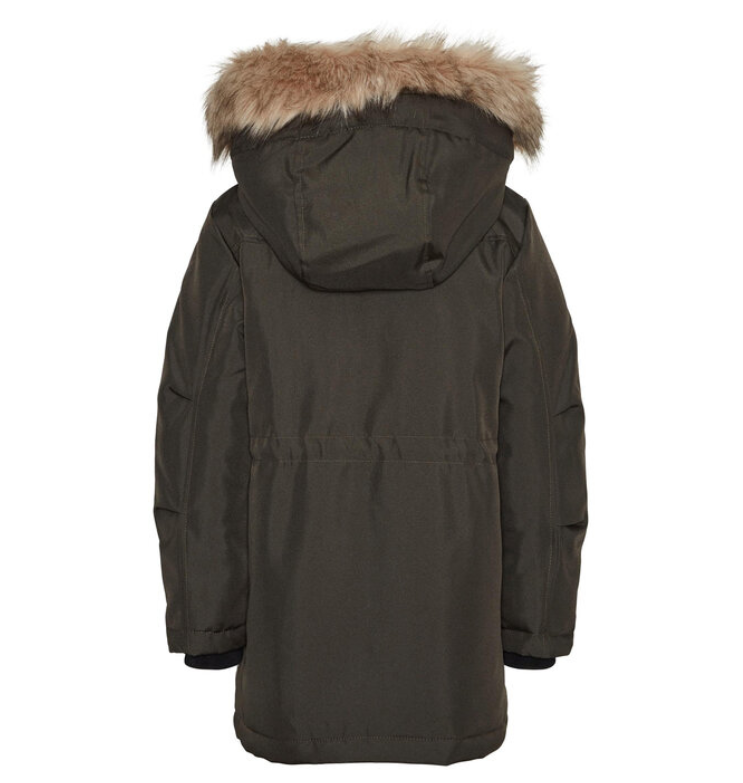 Vaik. žieminė striukė, tamsiai žalios spalvos, ilgomis rankovėmis, nuimamas gobtuvas su dirbtiniu kailiuku, šoninės kišenės, užsegimas užtrauktuku ir spaudėmis.