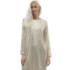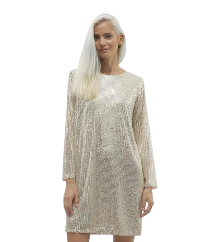 Mot. kokteilinė suknelė, aukso spalvos, ilgomis rankovėmis, apvali iškirptė, su žvyneliais, tiesaus kirpimo.