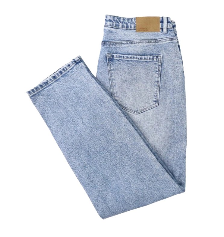 Mot. džinsai, šviesiai mėlynos džinso spalvos, tiesaus kirpimo, užsegimas saga ir užtrauktuku, diržo kilpos.