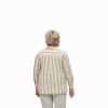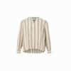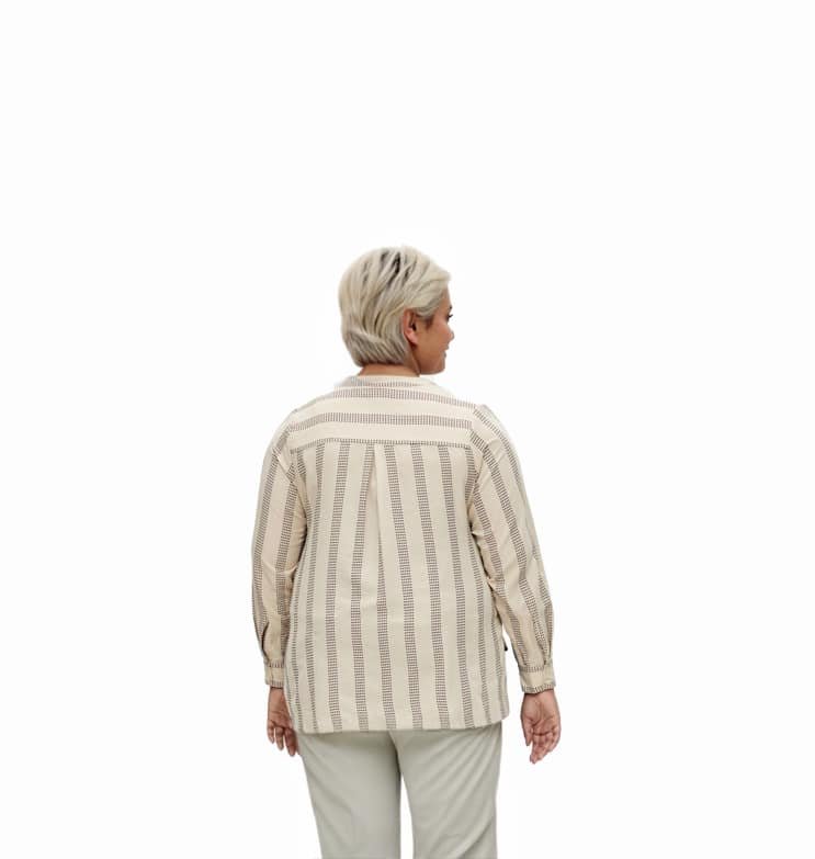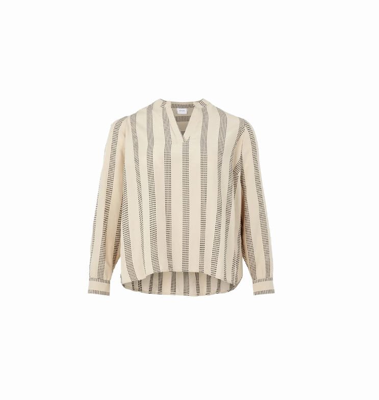 Mot. palaidinė, smėlio spalvos, ilgomis rankovėmis, vertikaliu dryžuotu raštu, V formos iškirptė, nugarinė dalis ilgesnė, nei priekinė, audinys lengvas.