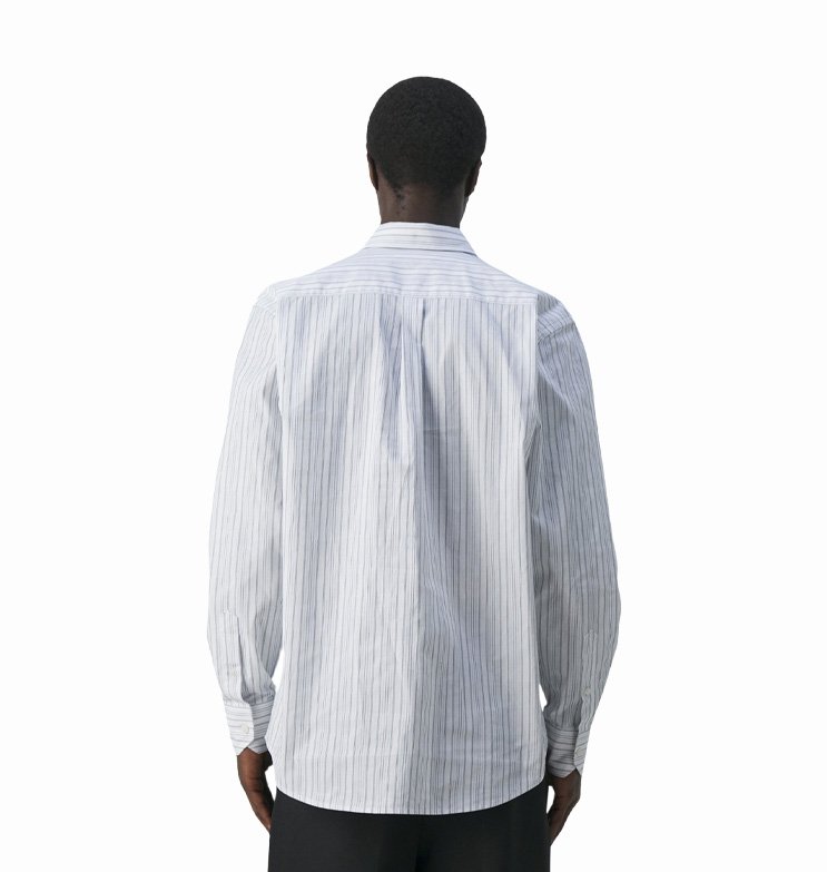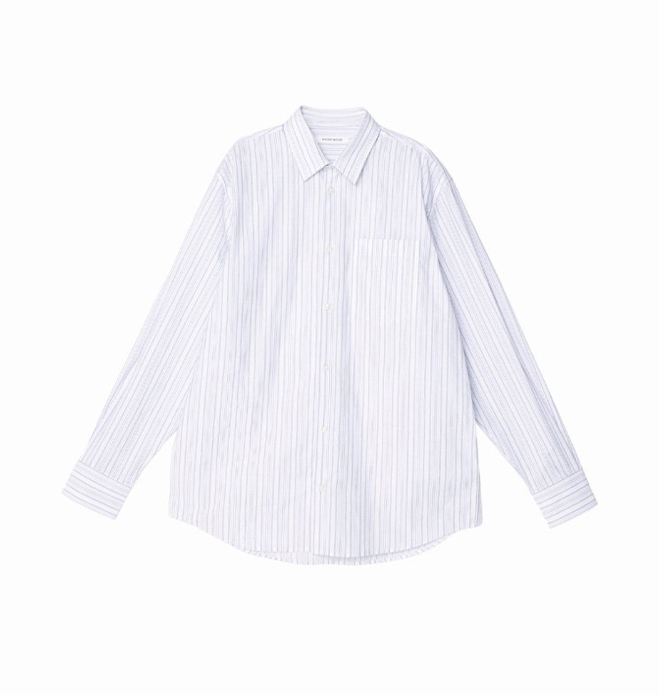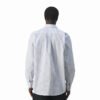 Vyr. marškiniai, baltos spalvos, ilgomis rankovėmis, atlenkiama apykaklė, užsegimas sagomis per visą ilgį, kišenė krūtinės srityje, dryžuotas raštas.