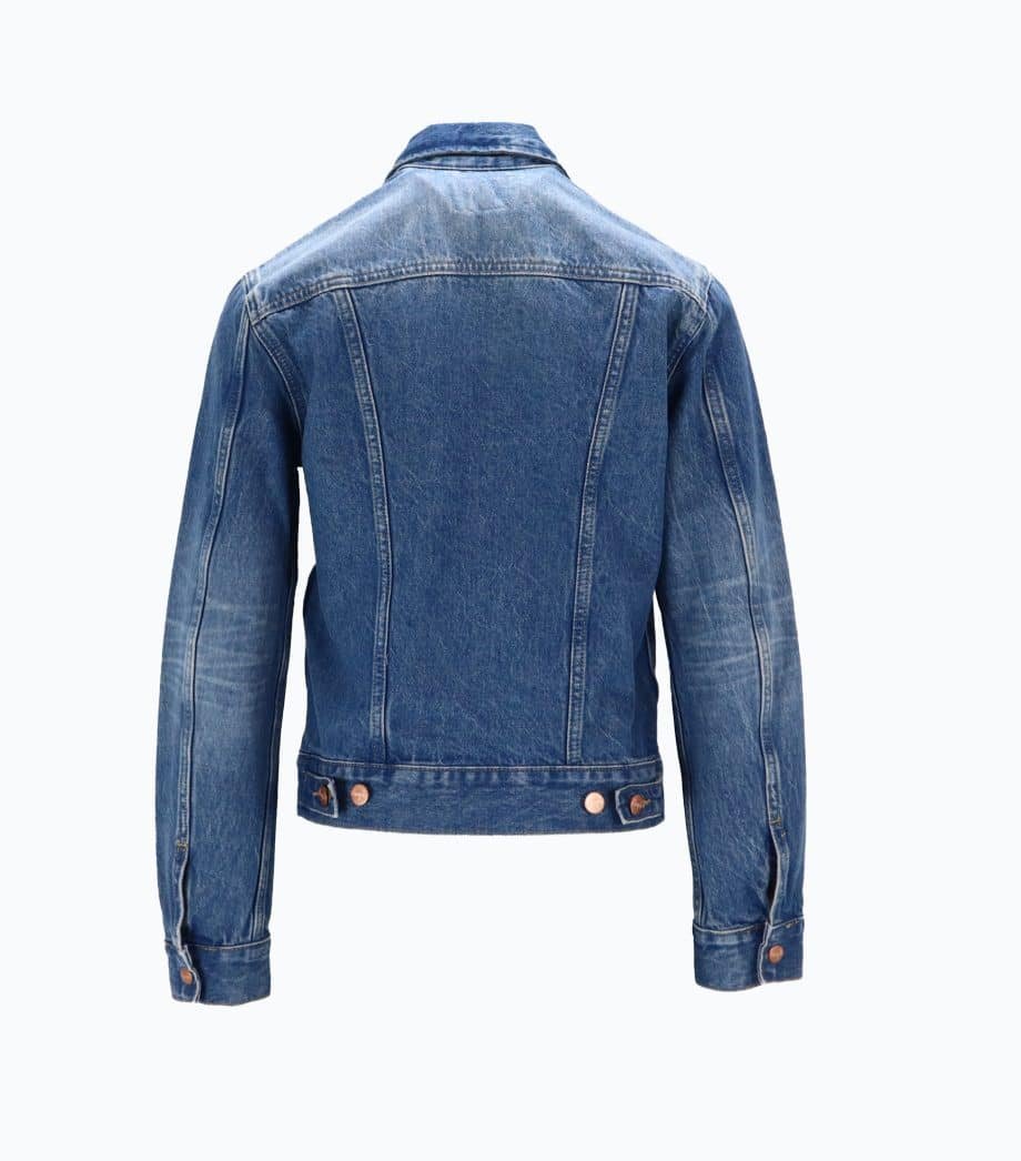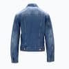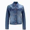 Mot. džinsinis švarkelis, mėlynos spalvos, ilgomis rankovėmis, atlenkiama apykaklė, šoninės kišenės, užsegimas sagomis.