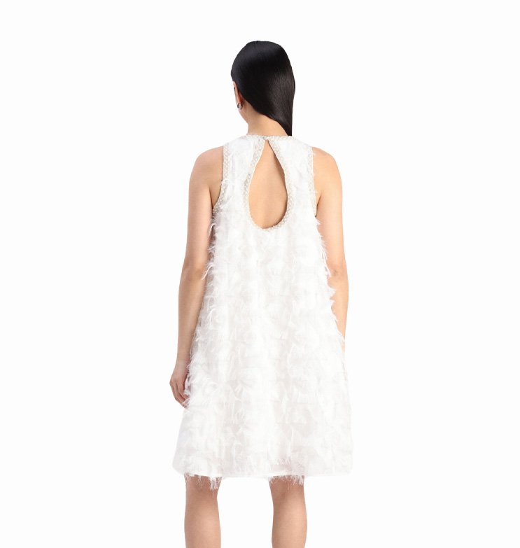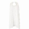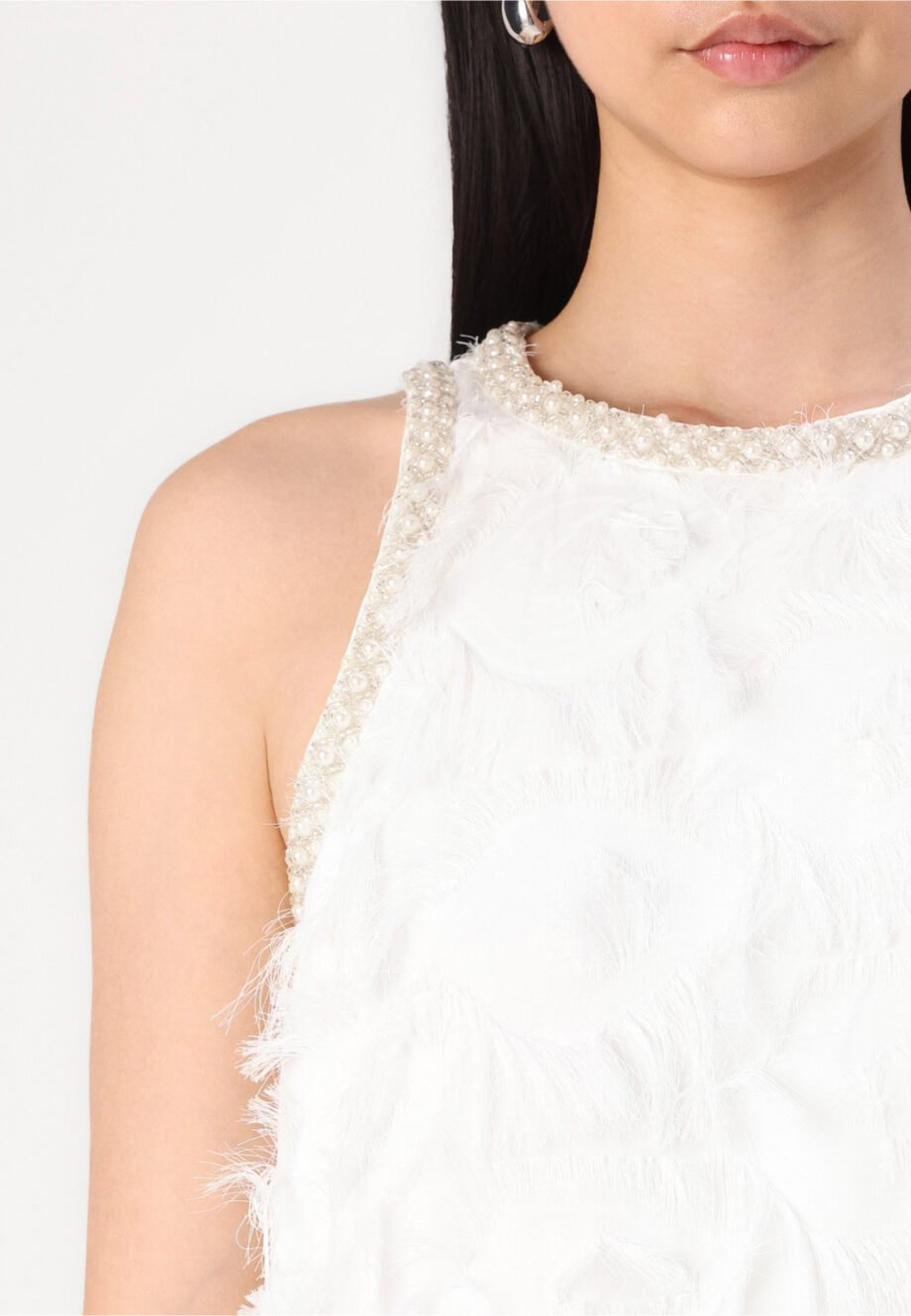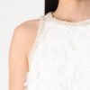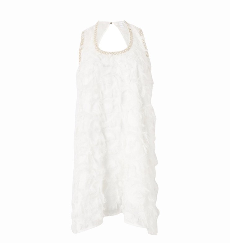 Mot. kokteilinė suknelė, baltos spalvos, apvali kaklo iškirptė, užsegimas sagute, iškirptė nugaroje, dekoruota kutais ir dekoratyviniais akmenimis, be rankovių.