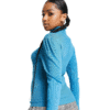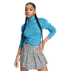 Mot. megztinis, žydros spalvos, ilgomis rankovėmis, atlenkiama apykaklė, vienspalvis raštas.