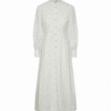 Mot. suknelė, baltos spalvos, ilgomis rankovėmis, stati apykaklė, užsegimas per visą ilgį, maxi ilgis.