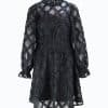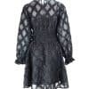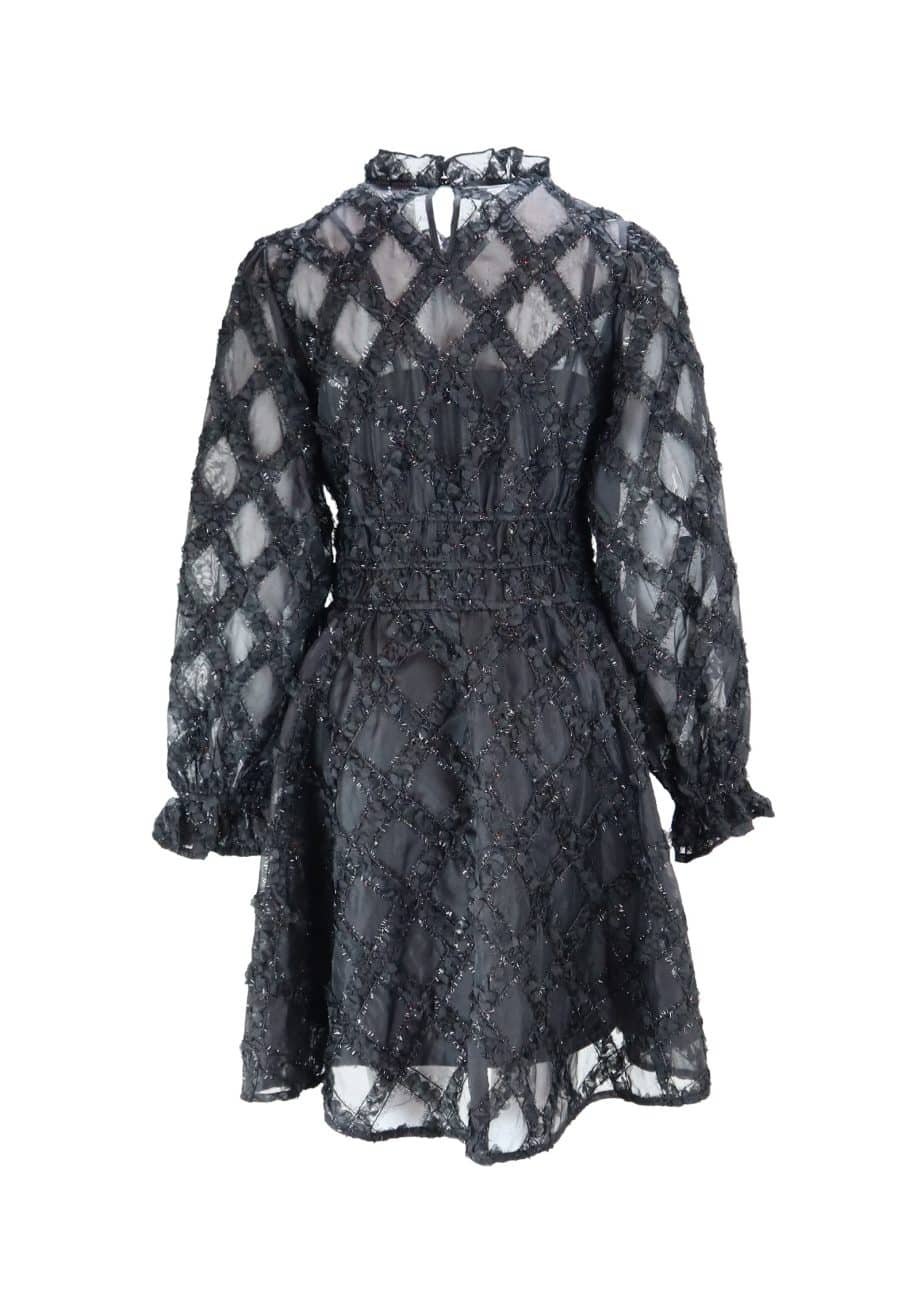 Mot. suknelė, juodos spalvos, ilgomis rankovėmis, stati apykaklė, užsegimas saga, vienspalvio rašto,tiesaus kirpimo, liemenuota.